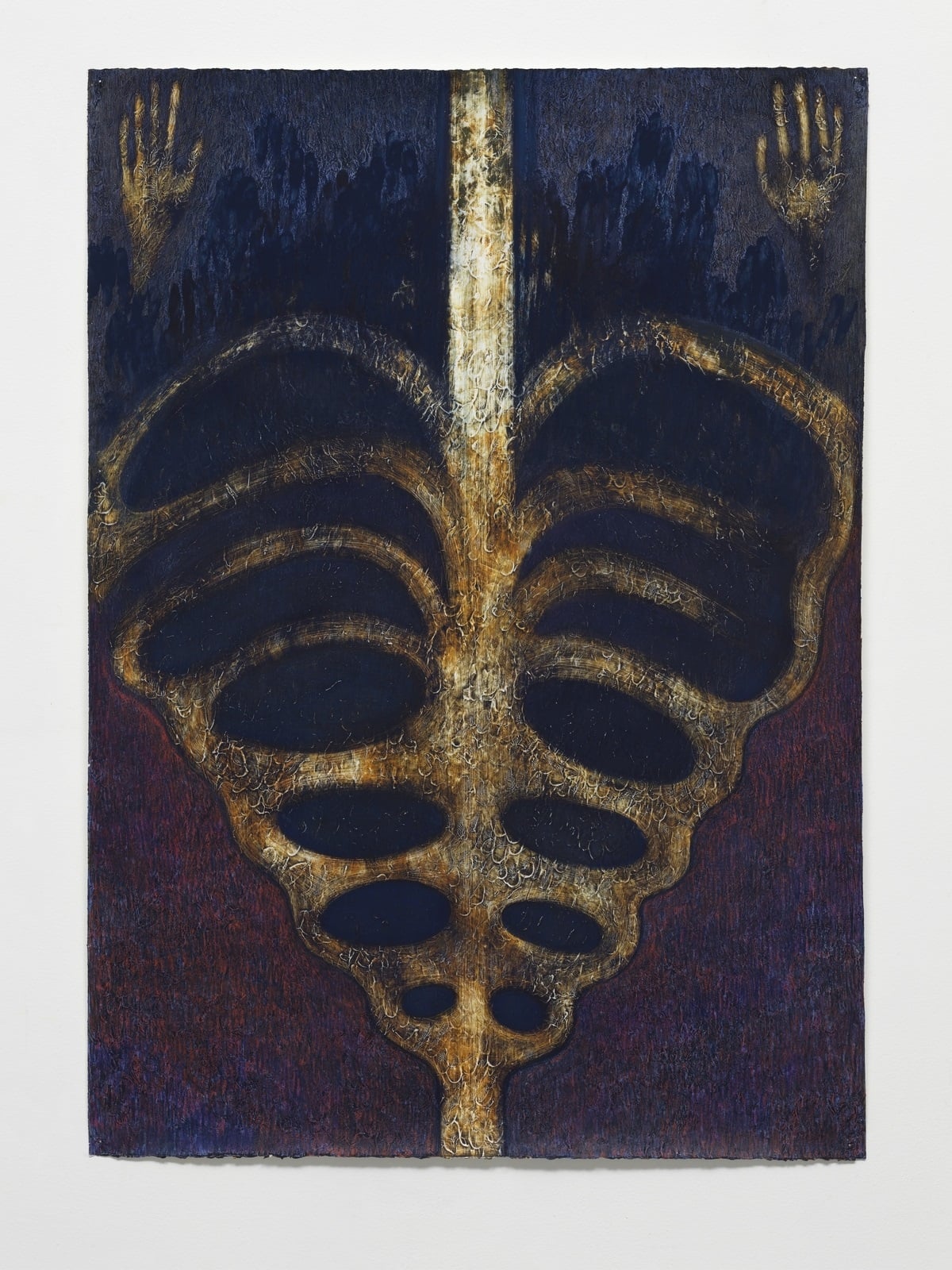 Sono casse toraciche luciferine, ora dritte ora capovolte, con costole che somigliano a gironi infernali e alvei oscuri, al centro delle nove opere, ognuna titolata per ricordare una forma di “inferno sulla Terra”: l’impotenza, la solitudine, l’ansia, l’abuso, la guerra, la separazione, il bambino non voluto, la perdita, l’ingiustizia. Dopo due anni di pandemia, diritti civili erosi (compreso il qui rappresentato aborto) e dilaganti conflitti armati, è difficile non sentire la forza e l’onestà del messaggio dell’artista, difficile non percepire un misto di rabbia e tristezza. Dei gradienti cromatici sui temi del blu (caro all’artista) accompagnano questa catabasi dai tratti più che terreni, dove mani significanti indicano quella “linea spezzata” che dà il nome alle diverse opere. “’The Inferno, Broken in Nine Pieces’ è una riflessione su nove stati emotivi che prendono inspirazione dalla nostra contemporaneità e, inevitabilmente, anche dalla mia percezione del mondo”, racconta Luisa Rabbia ad Artribune. “Sono situazioni o stati psicologici che ognuno di noi può aver vissuto o potrebbe potenzialmente vivere nel corso della propria vita. L’inferno su cui ho riflettuto è un inferno terreno. Ispirato dalla ‘Voragine Infernale’, disegno chiave fra i 92 eseguiti da Sandro Botticelli per rappresentare l’inferno dantesco, nel mio inferno i gironi botticelliani sono diventati ossa della cassa toracica. Non ci sono peccatori, ma solo ‘vittime’ della vita stessa”. L’artista si discosta così dalla prima ispirazione letteraria, per affrontare il tema ancestrale del “male” con un approccio empatico e intimo, che conferisce al colore puro del pastello, steso o raschiato, una connotazione emotiva che ci porta al centro di una compassione senza giudizio.