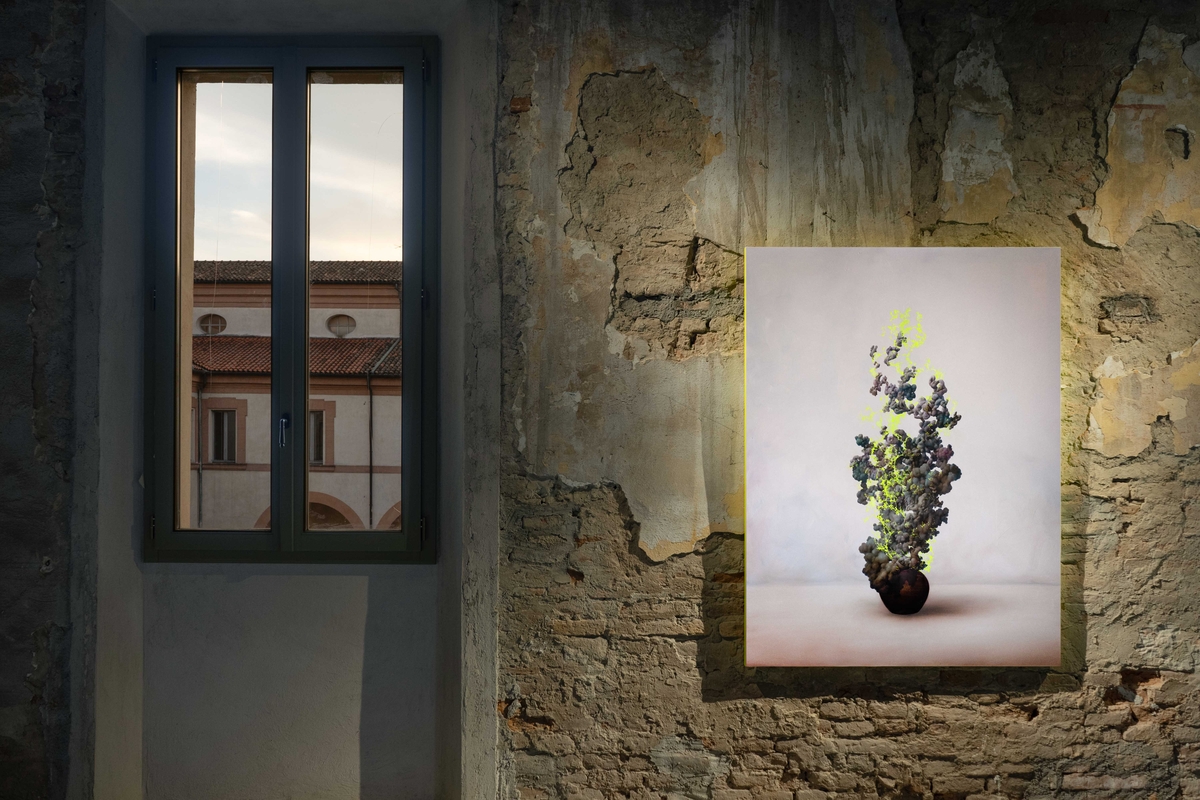 A un primo sguardo verrebbe da chiamarle nature morte. Ramificazioni intrecciate, esplosioni cromatiche all’apparenza floreali, che dal vaso si dipanano stagliandosi in primo piano davanti a uno sfondo indefinito. Un tranello che Enrico Minguzzi (Cotignola, 1981) si diverte ad architettare con devota attenzione al dettaglio e una precisione pittorica, per così dire, fiamminga. Ma di “morto”, a ben vedere, c’è ben poco nell’ultimo ciclo di opere scelte per la mostra al Museo delle Cappuccine, negli spazi dell’ex Convento di San Francesco, a Bagnacavallo. Così come nessuna di quelle composizioni che sembrano presentare rovi, muffe, fumi e coralli trova una propria collocazione nella natura che conosciamo. È l’inganno offerto da La piena dell’occhio, espressione che, oltre a dare il titolo alla mostra curata da Saverio Verini, spiega anche il passo che sta a monte del processo creativo.