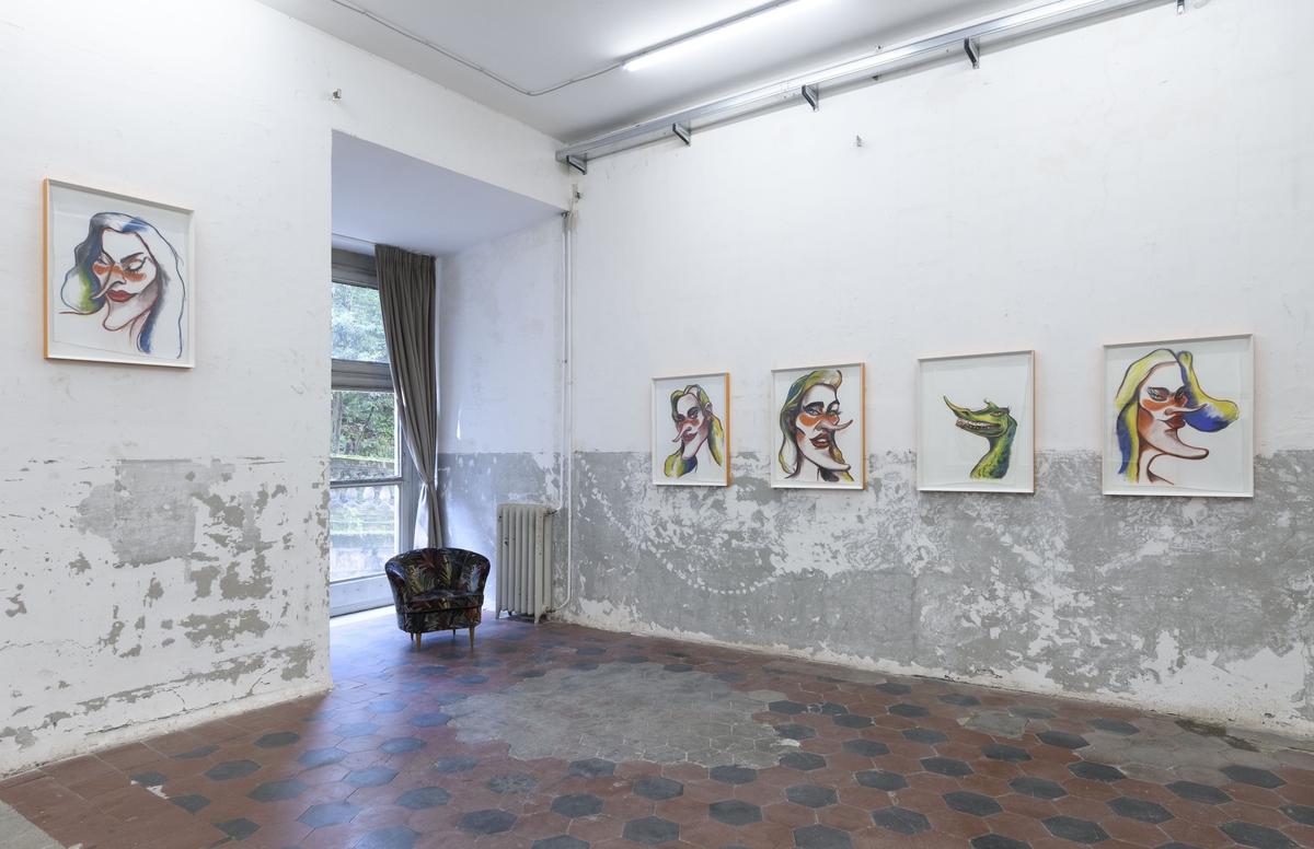 Rispetto agli anni precedenti al 2020, i soggetti ritratti da Presicce si sono evoluti raggiungendo codici pittorici ben definiti. Una rivoluzione estetica che si evince dai tratti somatici contraddistinti da nasi lunghi e appuntiti, menti ricurvi e zigomi sporgenti, assieme a labbra pronunciate e acconciature impossibili. Dettagli ripetuti assiduamente nelle pitture di grande e piccolo formato che tappezzano le pareti di entrambi i piani di Contemporary Cluster, fino ad arrivare alle ultime ceramiche che, poste a mezz’aria, “aleggiano” nella stanza in tutta la loro delicatezza e fragilità.