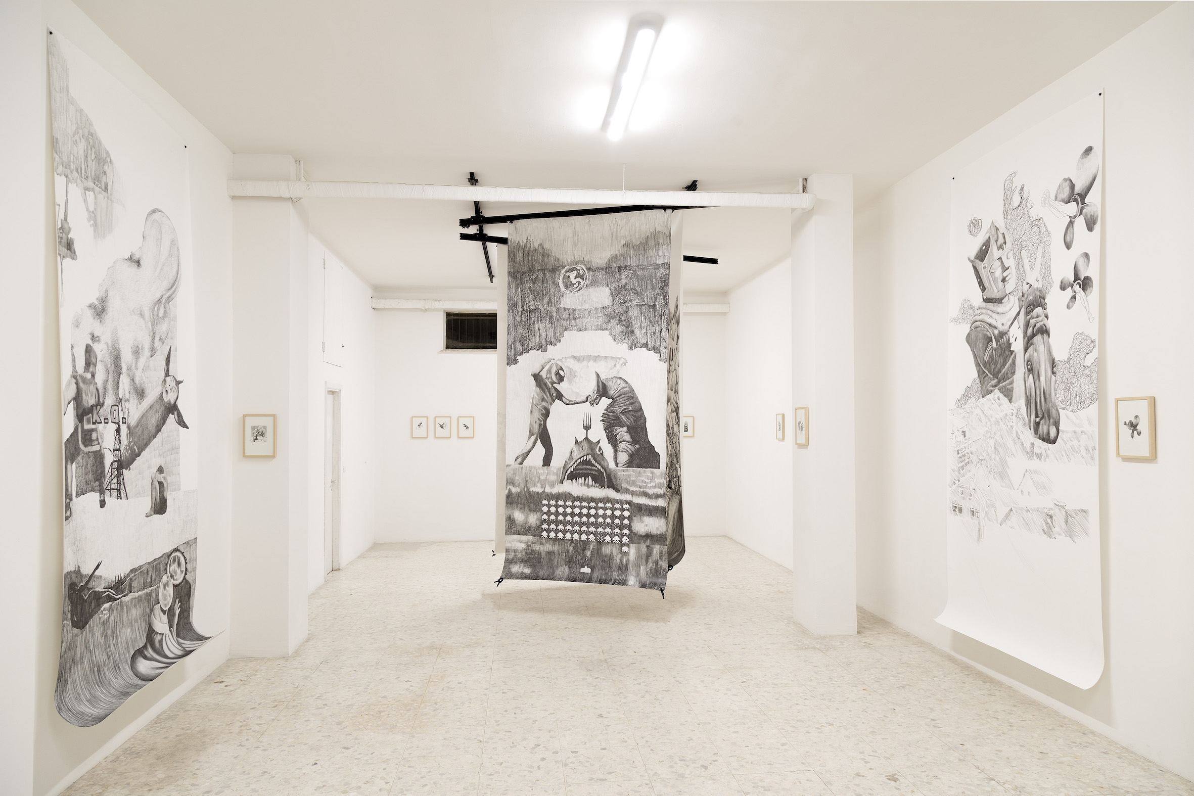 Spremuta d’incubo è il titolo della mostra di Giorgia Mascitti (San Benedetto del Tronto, 1995), e consiste in nove grandi carte verticali allestite scenograficamente all’interno di Spazio Sei. I disegni in grafite attirano così l’attenzione dello spettatore, richiamando a scenari di mondi altri, a metà tra sogno e incubo. “Queste grandi carte, che quasi creano una sorta di labirinto, sono popolate perlopiù da personaggi senza volto, strani animali, entità antropomorfe, mostri riconducibili a bestiari medievali anziché contemporanei”, scrive Maria Letizia Paiato nel testo critico. “Super eroi? Robot? Rottami? Ibridi non meglio definiti, elementi fuoriusciti da videogiochi anni ’80, il tutto incastonato in paesaggi urbani o scorci di natura di mondi surreali ma del tutto verosimili. Sono mondi distopici, in rovina, allucinati, catastrofici, claustrofobici, come già detto, infine, apocalittici, dove la fine appare concretamente imminente”.