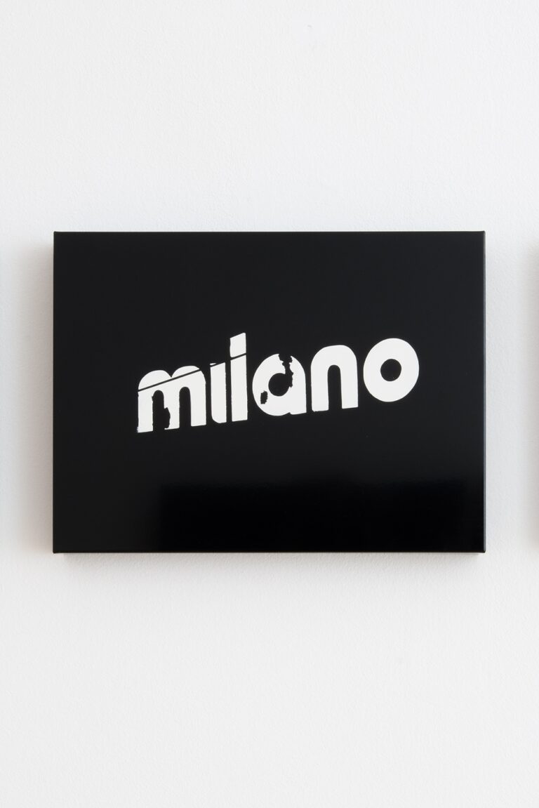 La ricerca di Massaro, invece, trae origine da uno studio sulla cultura visuale contemporanea. Massaro estrapola il testo da alcune fotografie da lui scattate. Le parole, riprodotte poi su “tele” metalliche nere, vengono isolate dal loro contesto di appartenenza, e dunque evidenziate sia nel concetto che rappresentano sia nella loro forma propriamente visiva (il font, la dimensione, la posizione che occupano nello spazio).