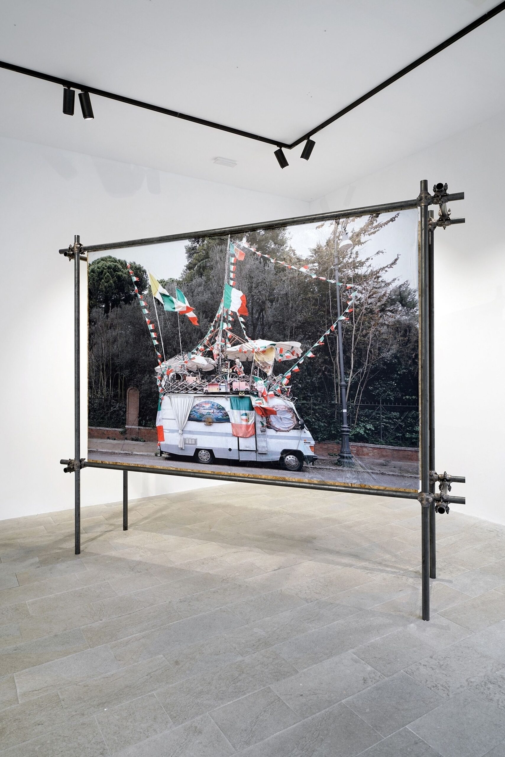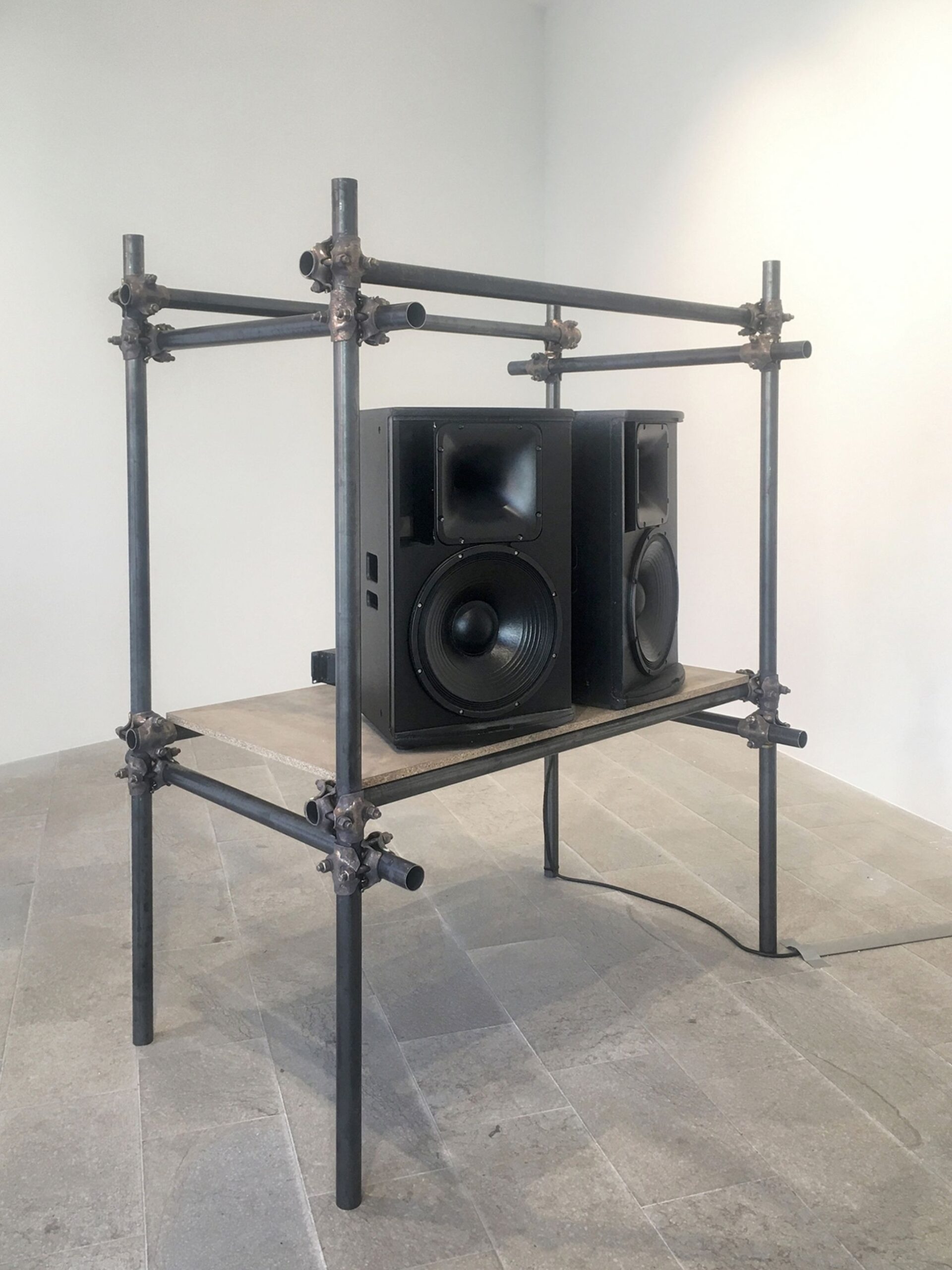 L’esposizione si sviluppa su due canali, visivo e sonoro: da una parte, su una struttura composta da tubi innocenti, si stratifica sui due lati, giorno dopo giorno, un flusso di manifesti di grande formato che documenta le azioni performative e i blitz dell’artista, dall’altra i suoni provenienti da alcuni video e performance si ridefiniscono assumendo sempre nuove connotazioni.