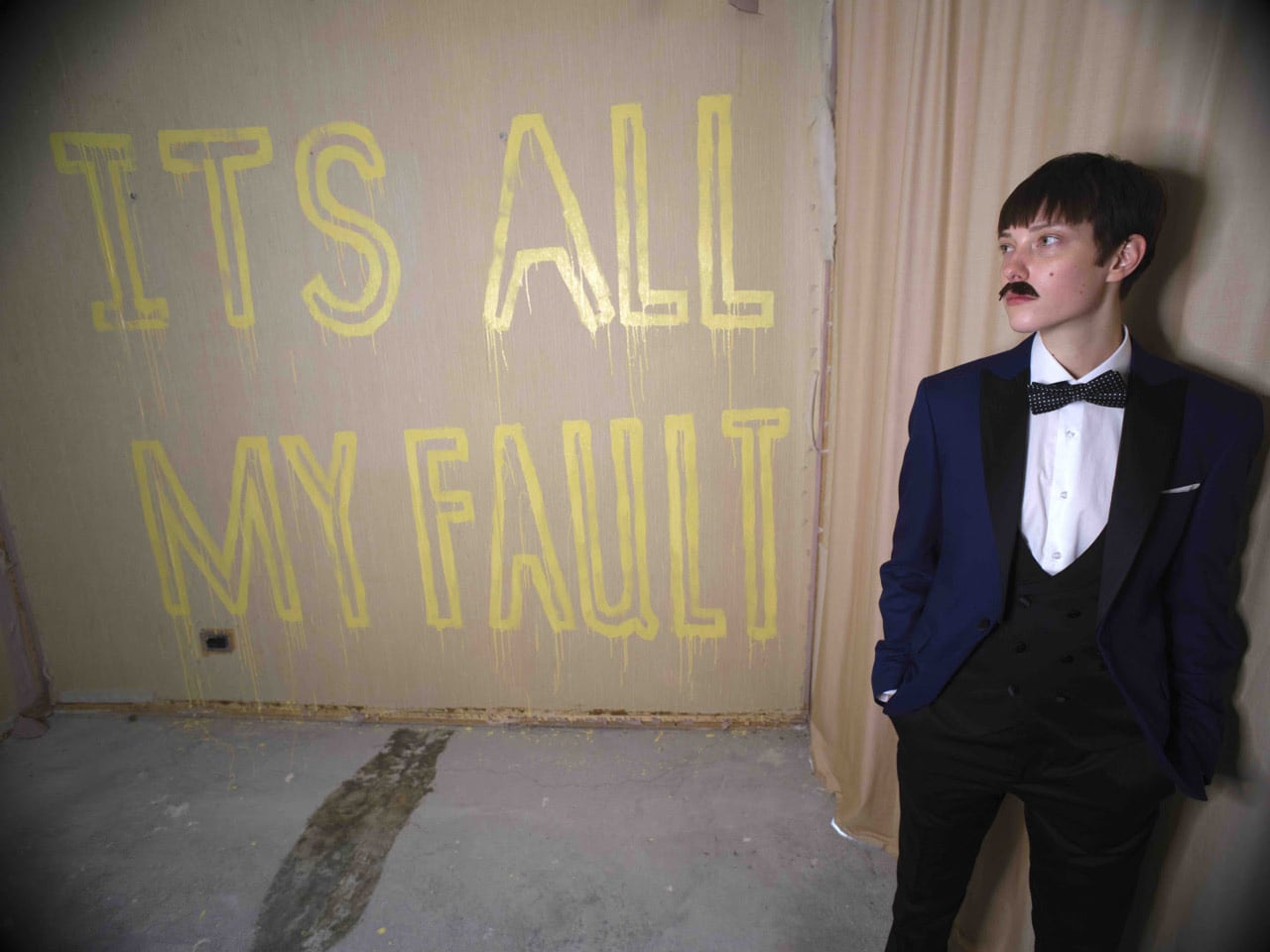 Unica costante in questo panorama ibrido è l’ammissione di colpa dell’artista: “it’s all my fault”, che dipinge a caratteri cubitali su una parete della stanza e che ancora permane. L’intervento site specific è l’unica testimonianza reale della sua azione “delittuosa”.