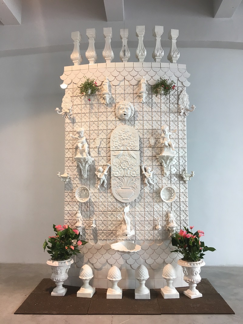 L’installazione realizzata dall’artista portoghese è un inno all’amore e riproduce una gigantesca e pannosa torta nuziale, decorata con putti, delfini e arabeschi in finta glassa. Tutto realizzato in ceramica