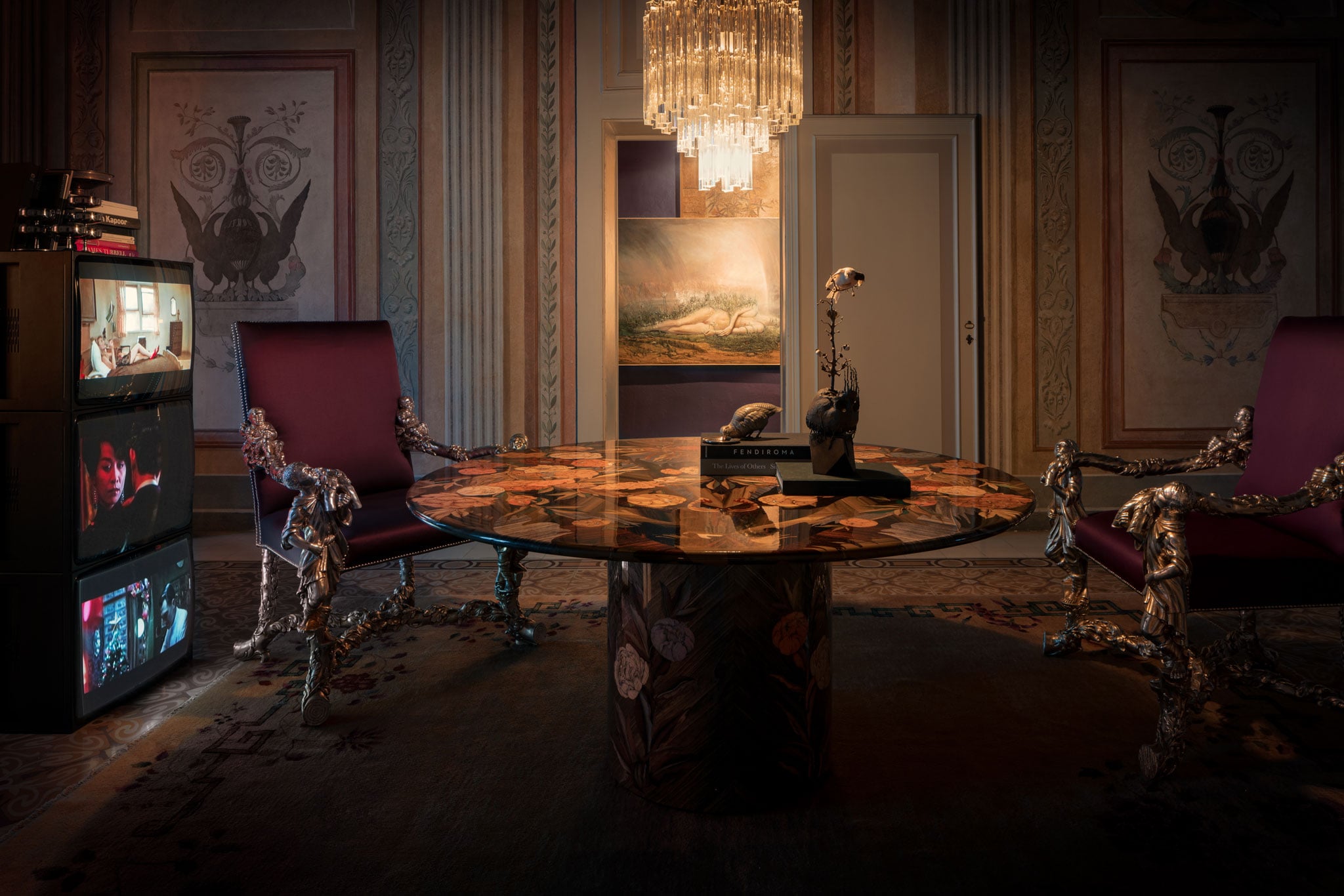 La visione di queste opere ha ispirato a Daminelli alcuni pezzi d’arredo. Al centro della sala successiva troneggia infatti un imponente tavolo circolare dove il mondo floreale di Arrivabene sembra essersi adagiato su straordinari decori a intarsio e laccature eseguite secondo tecniche rinascimentali. Nell’ultima stanza il viola cardinalizio dei divani in seta offre una sosta perfetta per contemplare il vero protagonista di Oro del vespro: un grande telero di tre metri per due, dipinto a olio con quattro colori. Erotomachia infera fa parte di un corpus di opere a cui Arrivabene sta lavorando da diversi anni. L’obiettivo è quello di portare a compimento l’ambizioso progetto di illustrare La Divina Commedia dell’Alighieri. La grande tela di Arrivabene si rivela una nube densa di corpi fluttuanti dove pullulano incastri di teste, gambe e braccia sofferenti: il tutto illuminato da una luce plumbea, come del resto Dante descrive nel suo V Canto dell’Inferno questo girone di lussuriosi. Solo in alto e sulla destra il cielo del telero si squarcia liberando uno spazio denso come un tizzone spento. In quel vuoto fluttuano i due più celebri fra gli amanti danteschi: Paolo e Francesca, avvolti dalla luce opalina che Dio riserva – solo a loro nell’infuriare della dannazione – come strumento di salvezza.