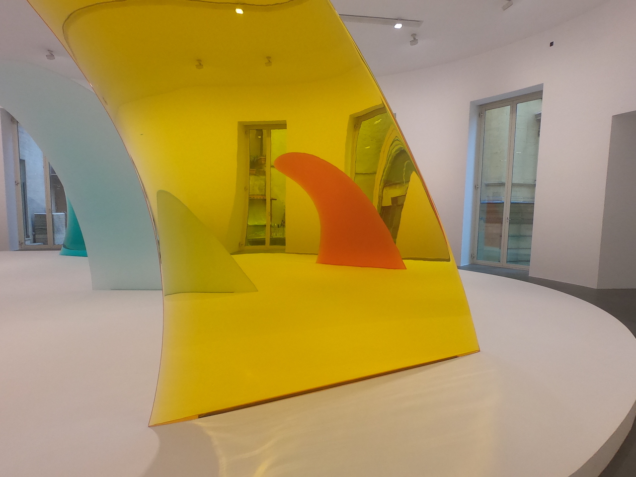 Ci troviamo nel salone ovale della galleria Gagosian di Roma, sovrastati dalle grandi sculture in plexiglas dell’artista multimediale e designer californiano Alex Israel, classe 1982, che, per l’occasione, espone una collezione di pinne di tavole da surf traslucide di varia cromia (lo stesso tema si ripete – ossessivamente ‒ negli acrilici delle sale attigue). Un richiamo intenzionale allo sport acquatico tipico del suo Paese, del quale sembra abbia voluto offrire una seriale metafora visiva. E che ci rimanda una debole eco di certi movimenti artistici sorti a Los Angeles negli Anni Sessanta del secolo scorso nel solco della Pop Art, come Light and Space e Finish Fetish, attenti all’interazione fluida e cangiante dell’oggetto-feticcio con la luce e lo spazio dell’ambiente espositivo.