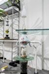 Fa quindi leva su una delle categorie temporali più oscure e misteriose, rivolgendosi addirittura all’AI, Upside Down Wells di Ajello e D’Isa. Le attraenti immagini collocate nei lucernari e sul soffitto del corridoio della sede IED sono l’esito di un processo in cui è stato coinvolto lo stesso collettivo curatoriale. Restituiscono, infatti, i sogni del team tradotti in promt impiegando programmi di AI per la creazione di immagini. Priva di un’identità cromatica, la miscellanea di disegni da osservare con il naso all’insù è, evidentemente, un’opera unica e irripetibile, esito di uno sforzo non solo umano. Dandosi tempo e perdendosi nell’intricato vortice a fil di ferro di segni prendono vita inattese composizioni figurative, riflesso di altrui visioni notturne. Riunisce, infine, più dimensioni temporali ed entra in relazione con la nobile macro-categoria del tempo della storia Soffio di Namsal Siedlecki, la scultura di una testa in vetro soffiato realizzata a partire da un’antica statua in bronzo.