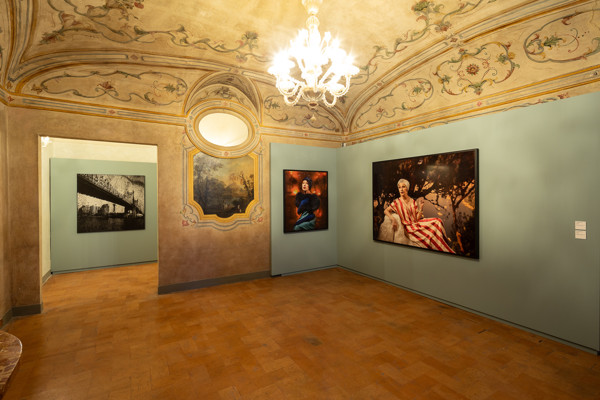 L’ultima sezione della mostra si snoda nello sfarzo rococò dell’Appartamento Settecentesco, dominato dai temi di simulazione e dissimulazione. Le fotografie di Cindy Sherman, l’opera video dell’artista gay Klara Lidén in dialogo con quella di Kjartansson. E infine, l’opera di Lorna Simpson che dà il titolo alla mostra e le finestre di Ryanne Tanet. Oscurate proprio con quel filtro blu che nasconde la luce, provocando una mimesi di nome: effetto notte.