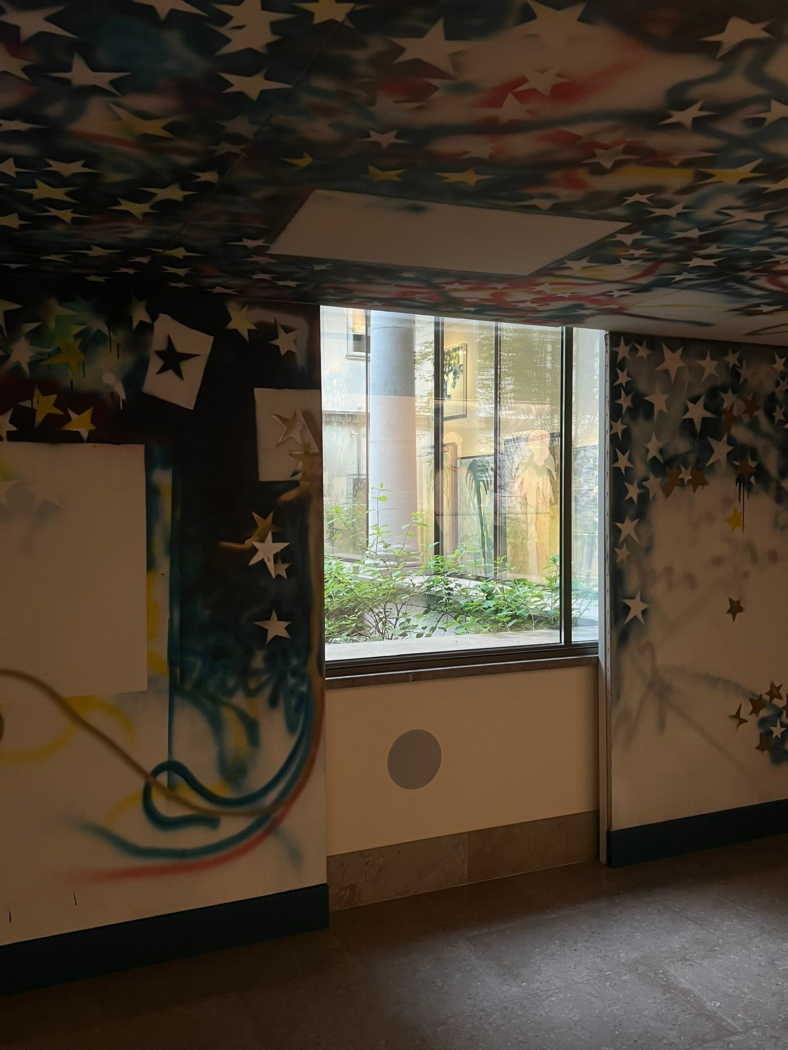 “Un unicum, una prospettiva assolutamente nuova nella pur vastissima serie di mostre dedicate all’artista con opere di grandi dimensioni, realizzate appositamente per personaggi che come lui stavano vivendo le stesse sensazioni, e mai più esposte da allora”, esordisce il curatore e membro della commissione dell’Archivio Opere Schifano Marco Meneguzzo. Sono Inevitabile viaggio a Marrakesh, Compagni (bacio), Oasi (o Palme) e Tutte stelle alcune delle opere presentate mai viste e nemmeno fotografate fino a oggi. In particolare, quest’ultimo, è un lavoro composto da 8 tele concepite (nel 1967) per coprire pareti e soffitto di un soppalco nella casa a Roma della principessa Patrizia Ruspoli, fedelmente riprodotto in mostra: Schifano, tra moti poetici di stelle (di diverse dimensioni e colori) ed esaltazione dei sensi, crea un portale immersivo ispirandosi a esperienze personali (la sua infanzia in Libia, tra notti di stelle e palme), visioni psichedeliche e miti ed esplorando le dimensioni oniriche e immaginifiche della realtà. L’opera è accompagnata in catalogo da una fotografia di raro valore che ritrae la principessa fra i dipinti murali di stelle alla fine degli Anni ’60.