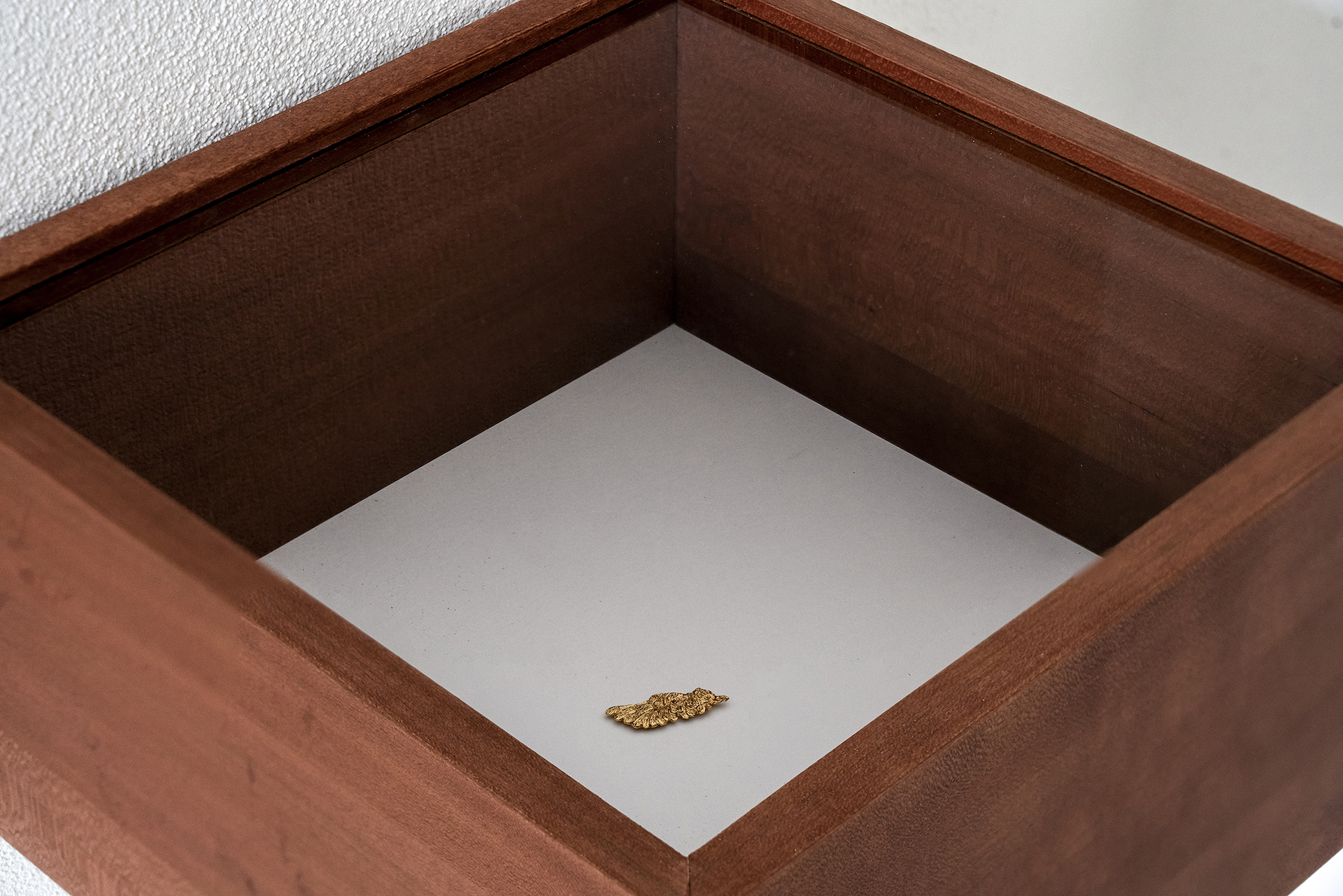 Per proporre un esempio più eloquente, si veda il mirato accostamento tra Una pura formalità (2023) di Michelangelo Consani, una piccola aletta in bronzo dorato deposta in una cassetta in ciliegio, e Studio per figura (2023) di Emanuele Becheri, dove una mensola in ciliegio regge una terracotta pigmentata caratterizzata da una massiccia torsione: non esiste una reale correlazione tra le due sculture, se non ideologica, con l’oggetto metallico che acquista interesse nella sua consistenza formale (probabilmente in origine era un giocattolo o comunque un elemento a-significante) mentre la ceramica accanto sembra quasi alludere al concetto del volo. La reciproca influenza tra i due artisti, chiaramente occasionale, frutta una bella presentazione, non esente da criticità (la teca sopra le due sculture cade comme un cheveu sur la soupe) eppure di grande effetto e apertura sperimentale.