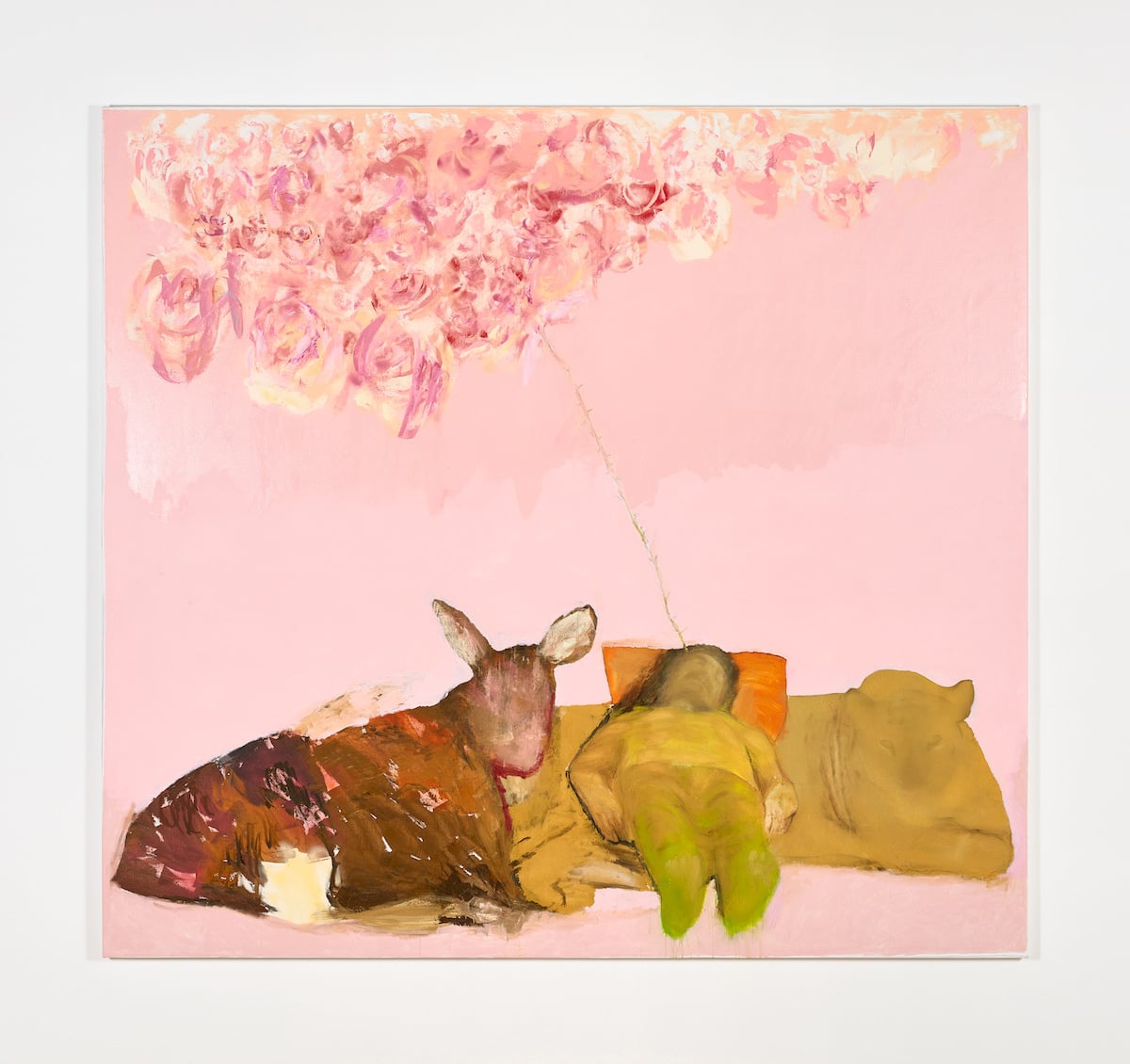 Una lettura a sé stante merita Love and Death (Dreamer), realizzato in occasione della mostra così come tutti gli altri dipinti di Pessoli: una pareidolia in cui scorgiamo un compianto su Cristo morto (o dormiente?) dove i custodi di questo sonno sono un asino e una leonessa diafana.