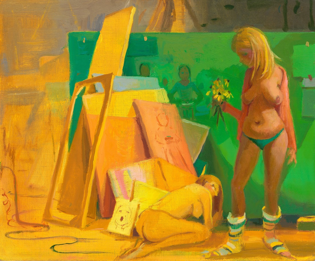 Il suo eccentrico esibizionismo comincia col bearsi alla vista di un proprio estetico capezzolino carminio e poi passa a considerare tutto il resto. È a quel punto che interviene la svolta fondamentale: sarà stato il suo anno di studio a Roma, saranno state le scoperte di alcuni pittori classici europei, da Giovanni Bellini (addirittura!) a Vermeer, da Degas a precisamente quel suo prediletto Interno verde (1891) di Vuillard, come è come non è, l’artista ormai matura ragiona sul colore – e più modernamente anche sul color field painting – e perimetra infine la propria cifra. I suoi nudi galleggiano così in un figurativo nebbioso che mischia reminiscenze classicissime – a volte introducendo elementi di paesaggio e altre di natura morta – con certa sbrigatività yankee normalmente un po’ pop che al di qua dell’Atlantico a nessuno sarebbe venuta in mente di utilizzare.