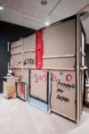 Così come le opere stesse – vincolate da cinghie colorate o sorrette da impalcature che ricordano una vera e propria scatola cranica –, anche il visitatore si trova in qualche modo costretto, forzato a non poter agire come vorrebbe, impossibilitato cioè a contemplare il tutto nella sua interezza. Inseriti all’interno dello spazio Wunderkammer della GAM (appositamente destrutturato sia come omaggio alla ricerca di Gordon Matta-Clark sia come affermazione del modus operandi iconoclasta di Benassi) i lavori selezionati si presentano accatastati e sovrapposti nel tentativo di occultare qualcosa per rivelare altro: una pratica già largamente utilizzata dal secolo scorso in poi (si prendano ad esempio opere quali L’enigme d’Isidore Ducasse, di Man Ray, o le installazioni ambientali di Christo e Jeanne-Claude) che ciononostante non smette di attrarre.
