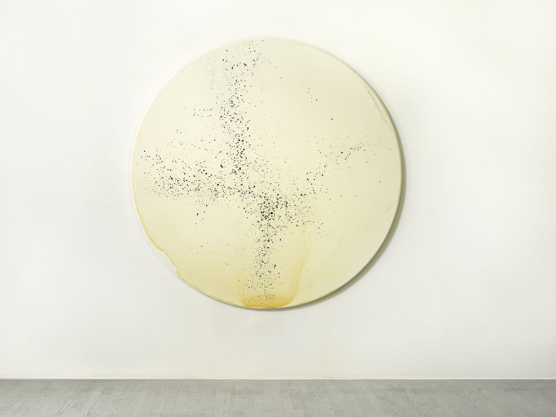 La serie tondos nasce da sperimentazioni più recenti e si presenta come una collezione di opere circolari di diversi colori. Il modus operandi, per quanto similare al processo adottato per gli exposed paintings, richiede un’azione quasi performativa da parte dell’artista che interagisce fisicamente con l’opera: il supporto è un pannello circolare di compensato preparato con gesso e vernice. La figura geometrica scelta, priva di angoli, suggerisce un’osmosi con lo spazio circostante, generando un dialogo molto più fluido e ‘senza confini’ con la galleria e con gli spettatori. La presenza quasi scultorea di queste opere fa sì che esse investano lo spazio suggerendo relazioni più intense e impattanti.