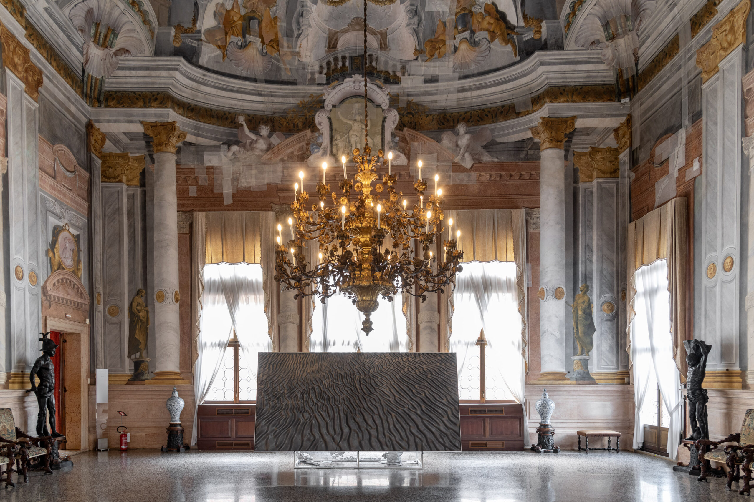 Sollevando lo sguardo e concentrandoci sui soffitti affrescati da Tiepolo, Guarana, Crosato e Diziani si nota come il cielo e le nuvole fossero elementi ricorrente per le “aperture” delle stanze, dando forma al famoso concetto di sfondamento. Elementi che, secondo i curatori Luca Berta e Francesca Giubilei, accomuna i maestri del Settecento e l’artista contemporaneo, trasformando “la nuvola un’unità intermedia, di passaggio tra reale e virtuale”, ovvero un mero elemento formale che corrisponde “all’idea di scultura modulare che si propaga in modo organico e libero, adattandosi allo spazio stesso e al luogo”.