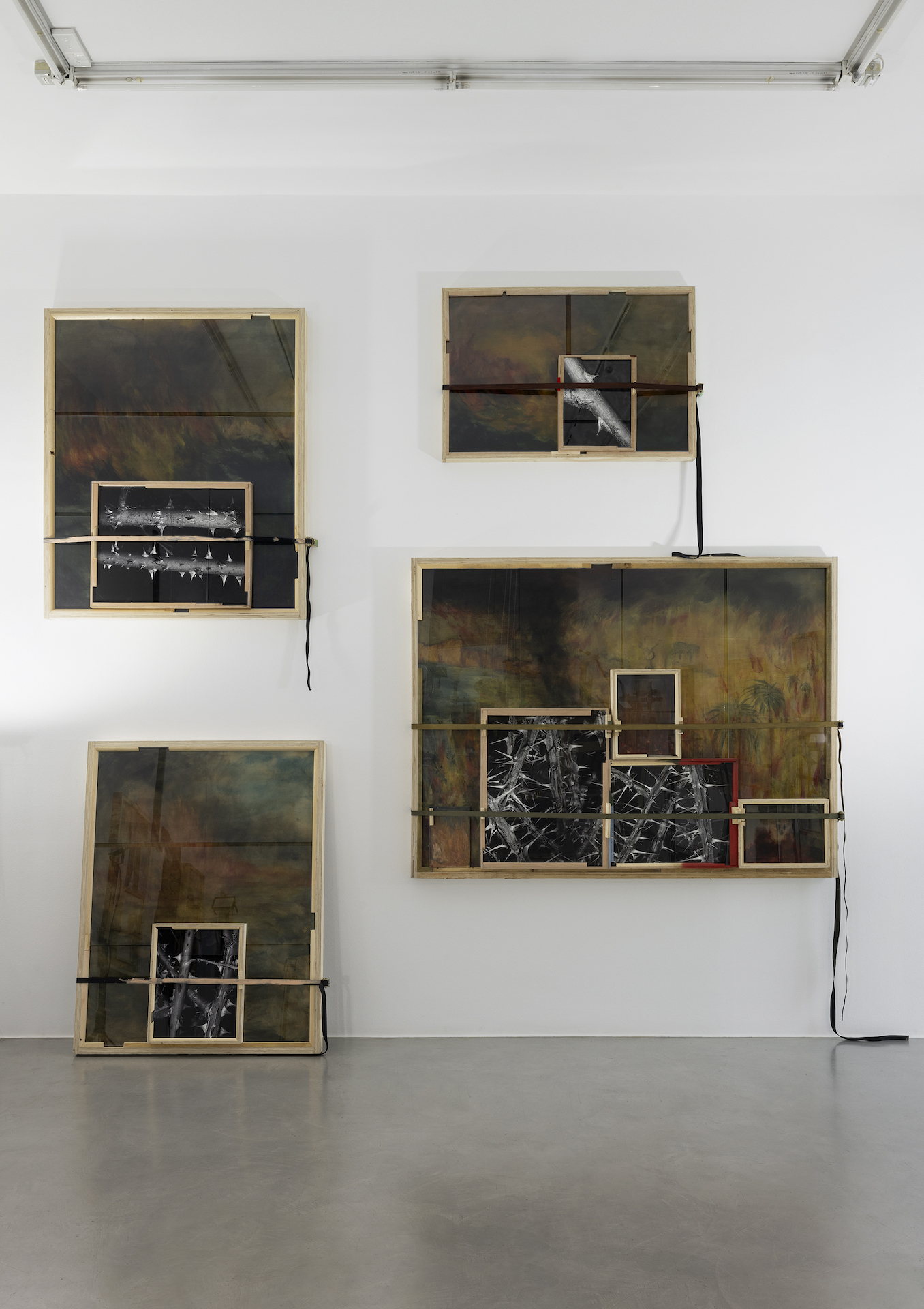 Oltre questa barriera, ecco appese alle pareti – sulle quali si intravedono residui di scritte fluorescenti vistosamente cancellate da chiazze di vernice nera – delle opere dai connotati ibridi, costituite da fotografie poste all’interno di cornici di compensato grezzo e mal tagliato, assemblate in scatole, schermate da vari impedimenti, sovrapposte e tenute insieme da cinghie a trazione. Se le immagini fotografiche, infatti, costituiscono pur sempre il leitmotivdelle mostre di Benassi, e ne sviluppano il filo narrativo, c’è da specificare che esse si oggettualizzano, si negano, si nascondono a vicenda, si inscatolano l’una nell’altra e interagiscono con altre cose: solo eccezionalmente vengono appese alla parete nella loro canonica integrità, ma sempre con cornici umili e mutilate.