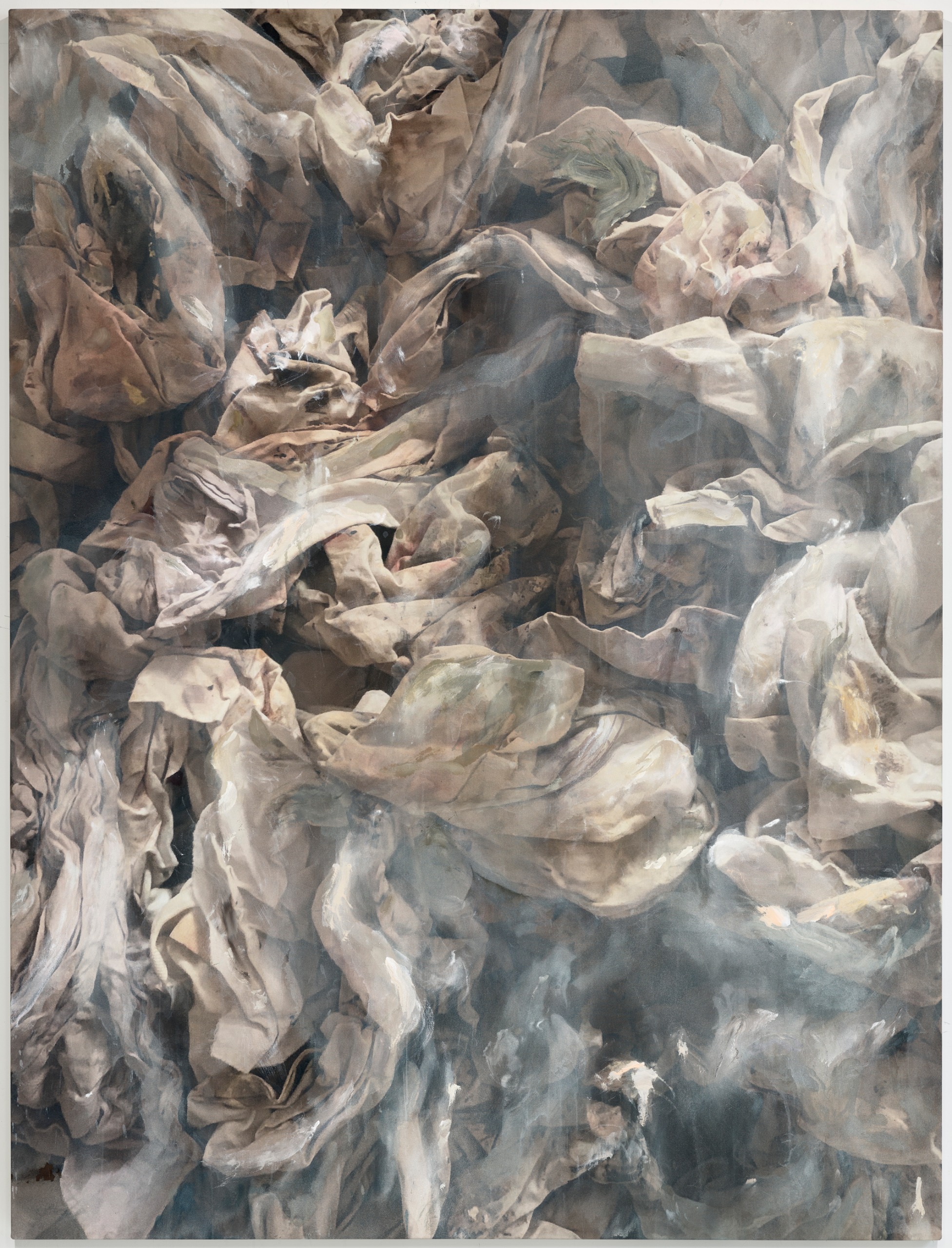 Si intitola Rags, letteralmente ‘stracci’, l’intervento ospitato nella preziosa Cappella Sansevero (anche chiamata chiesa di Santa Maria della Pietà o Pietatella), celebre per custodire il Cristo velato di Giuseppe Sanmartino, conosciuto in tutto il mondo per la magistrale resa del velo. Le opere presentate nella navata della cappella nascono dalle fotografie che l’artista ha potuto scattare nello studio londinese del pittore Lucian Freud (Berlino, 1922 – Londra, 2011), traendo ispirazione dai suoi panni sporchi di colore e creando un parallelismo con le narrazioni che il velo di Sanmartino evoca: “Mi sono ritrovato nello studio di Lucian a scrutare le pieghe e le forme degli stracci accumulati con cui aveva ripulito i pennelli per l’ultima volta, dettagli che ho fotografato e ingrandito, producendo degli ampi paesaggi mentali. Ma non era sufficiente, sentivo che doveva esserci un risveglio di coscienza, nello stesso modo in cui il velo della scultura di Sanmartino riesce ad attivare narrazioni interiori. Ho applicato anche io una sorta di sudario, stendendo un velo di pittura e colore sulle tele di stracci”.