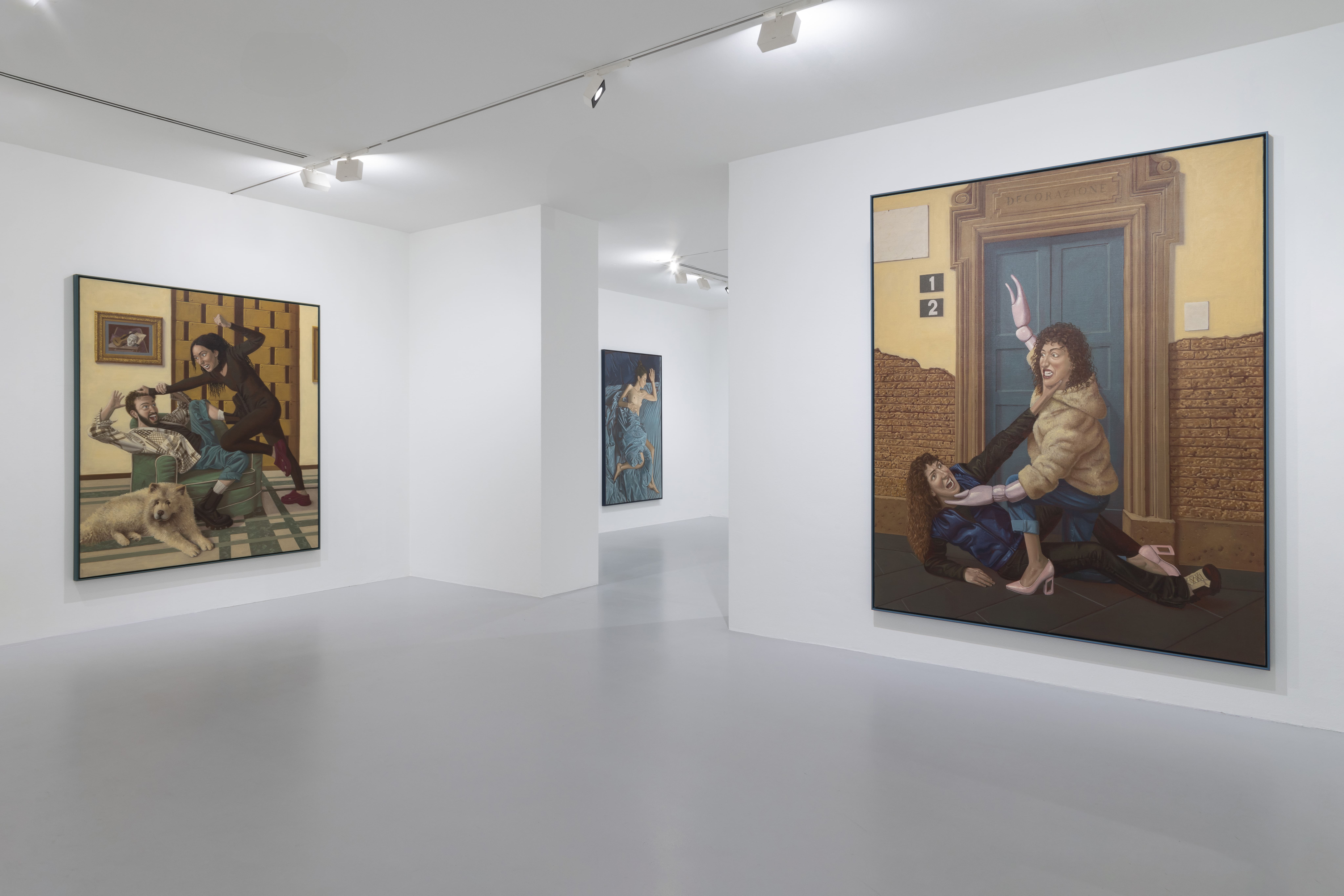 Nella prima personale negli spazi della galleria Gió Marconi: Amici, Nemici, Letti e Mariti (Friends, Foes, Beds and Beaus), i suoi quadri viventi, frutto di un anno di lavoro, raggiungono l’apice di un percorso di sperimentazione personale e artistico. Nelle sue pennellate invisibili pulsano stati emotivi, trasfigurati secondo un linguaggio che fonde pittura, digitale e performance. Il suo processo creativo inizia infatti con lunghi shooting fotografici nei quali coordina meticolosamente i suoi soggetti. Prima di dipingere, modifica la foto digitalmente: non cerca un attimo privilegiato, lo costruisce. Decide di non dipingere dal vero in un contesto storico dove la cultura visuale, grazie all’intelligenza artificiale, è infinitamente malleabile, lontana dal concetto di verità. Ed è così che smonta le emozioni e le ricostruisce in elaborate istantanee di quotidianità, con richiami ora all’iconografia classica, ora a quella contemporanea.