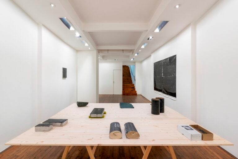 Le sculture in cemento e resina rivelano la predilezione dell’artista per il contatto con il materiale, il legame con la terra e la “terrestrità”, alla stregua di uno scienziato o un geologo; una condizione che emerge chiara da opere quali Atlas, Residui, Mappa-mondo, sculture geometriche che mettono ordine in immaginari paesaggi e universi, formando una sorta di “enciclopedia cosmologica” senza parole ma fatta di linee e colori, da decriptare come fosse un antico codice cifrato. Opere che sono tracce di ulteriori riflessioni e che lasciano intuire il dialogo fra l’artista e la materia, il continuo processo di costruzione e decostruzione, di cesellatura concettuale, di approfondimento della conoscenza, come uno scienziato che “provando e riprovando” (per citare il motto dell’Accademia del Cimento) manipola la materia e in parte la asseconda, tessendo una relazione intellettuale e creativa che lascia l’opera aperta a ulteriori futuri sviluppi suggeriti dalla sua stessa forma.