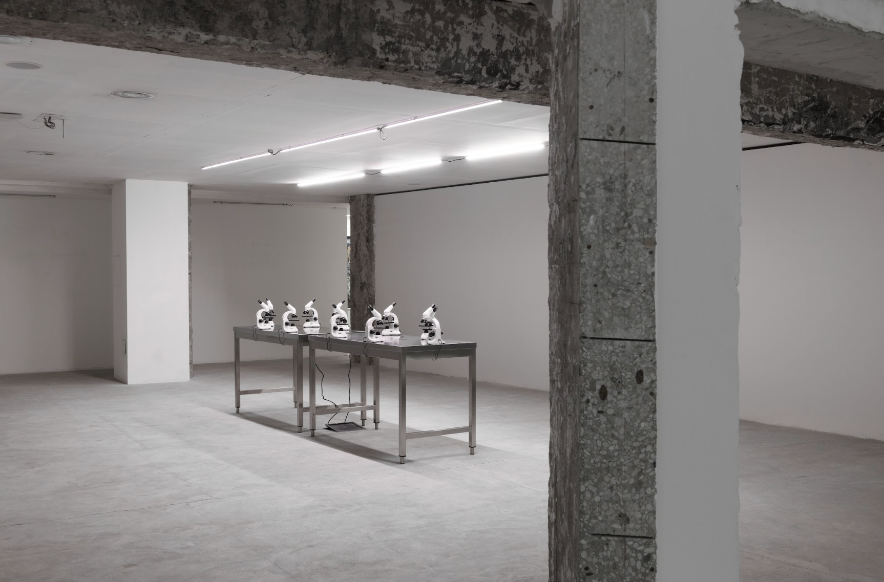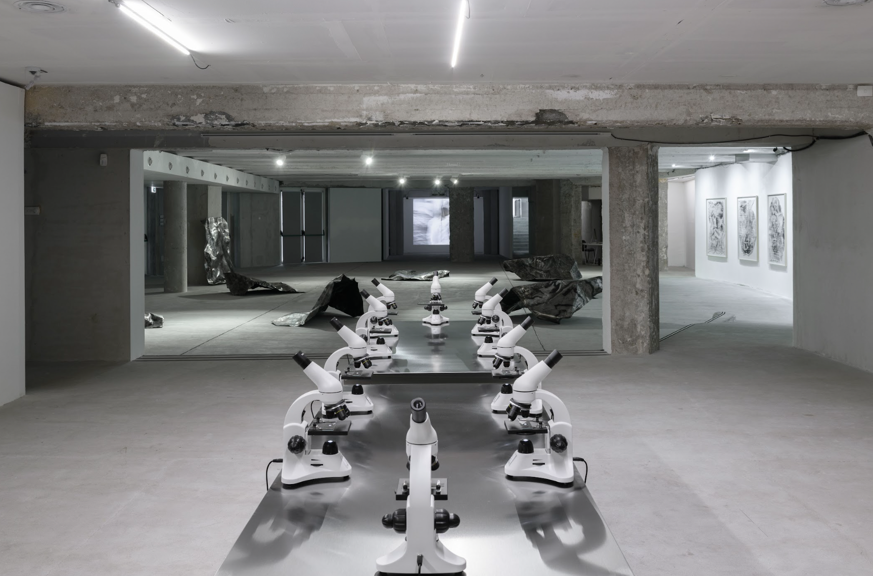 La mostra apre con la prima pagina de Il Quotidiano dell’Arte che annuncia la “scomparsa dei Canemorto”, raccontando il tragico incidente che ha messo a repentaglio il monumentale progetto espositivo del trio artistico per la Capitale. A cercare di portare luce su quanto è successo è il film Megalomanie, da cui poi parte il percorso espositivo, costellato dalle grandi matrici danneggiate che si spogliano della loro funzionalità per assumere quella scultorea all’interno dello spazio espositivo. A queste seguono alcune delle prove di stampa avvenute prima della distruzione e, infine, parte dello spazio viene adibita a laboratorio con una serie di microscopi da cui è possibile osservare microstampe identiche – nei dettagli e nei soggetti – a quelle monumentali.