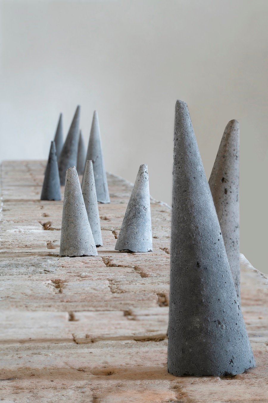 “L’opera di Alessandro Biggio si inserisce negli ambienti della Limonaia per la sua attinenza al processo di trasformazione che vede nel mondo naturale la sua origine e fine” spiega Jacopo Figura, cofondatore con Esther Biancotti della galleria FuoriCampo “Le sue sculture trasmettono un senso di primitivo da molteplici punti di vista: nella semplicità della forma dei coni, quasi elementi totemici di riti ancestrali, come nella fattura delle sculture di schiuma poliuretanica sospese, un’eco di un’era primordiale in cui la materia informe trova l’unità del concetto puro”.