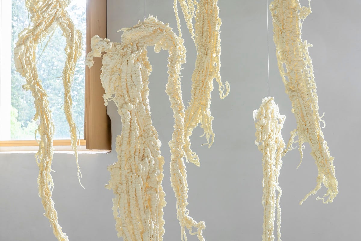 Schiume in poliuretano espanso, calate dall’alto del soffitto a travi, fluttuano come sospese nel grande spazio della Limonaia di Villa Griccioli, a Montechiaro, mentre i Coni di cenere scandiscono la “navata” dell’edificio, che per la prima volta si apre all’arte contemporanea, con un progetto espositivo pensato appositamente per la struttura.