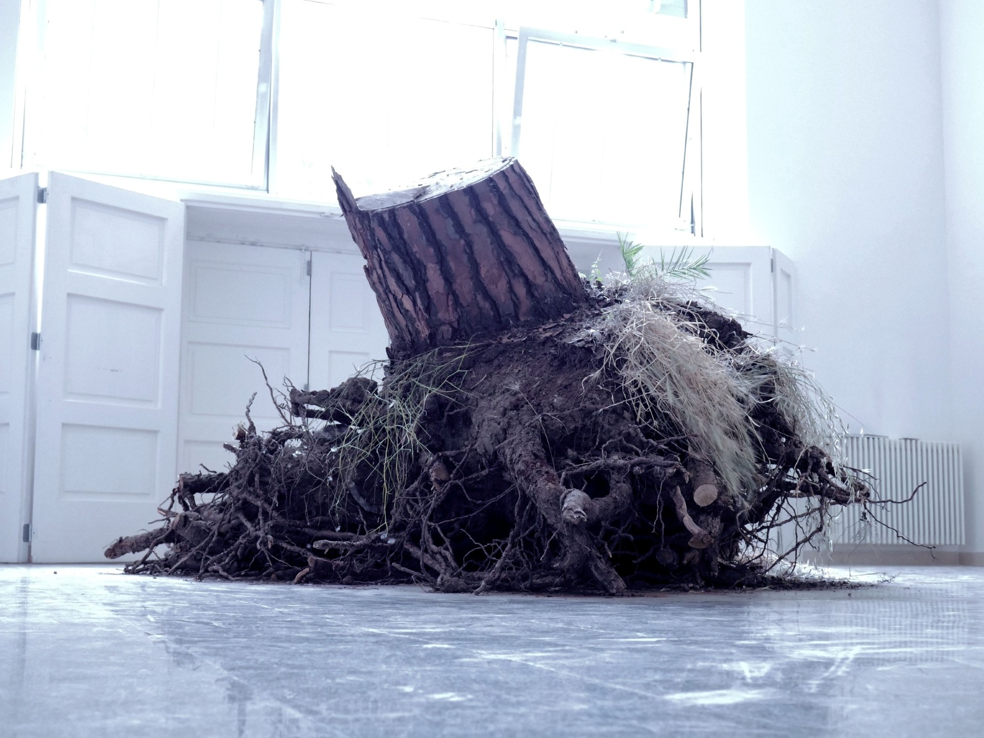 “Tra gli altri aspetti che volevo far emergere”, prosegue il curatore, “mi interessava esporre dei lavori in cui fosse presente l’elemento naturale, o meglio selvatico”. Così, al centro della sala del Macro troneggia il Ceppo Sradicato, 2018 un ceppo significativamente di pino marittimo, albero ricorrente anche nella storia del cinema, di Christoph Keller (Germania, 1967), mentre nei lati opposti della sala, la natura avanza. Da una parte in The Perennial Truth, 2025 di Bianca Bondi (Sud Africa, 1982) ove un giardino invade il bancone di un bar; dall’altra, delicati elementi naturali si innestano su sculture antiche nelle immagini della serie Excroissances, 2022, di Iván Argote (Bogotá, 1983), come per simboleggiare una natura che inizia a riappropriarsi dei monumenti e della storia.