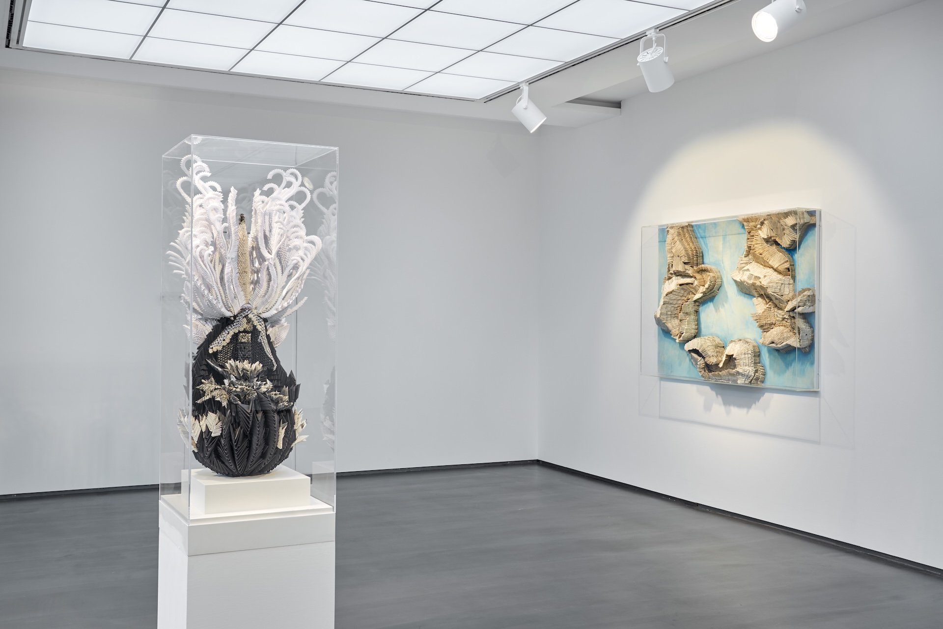 È un lavoro di tale precisione e pazienza da racchiudere qualcosa di intimamente religioso, non nei contenuti ma nella forma: una ritualità di gesti reiterati, che si susseguono come una litania senza fine, scandendo il tempo e infondendo alla materia un’aura di meditazione. La prima volta che vidi le opere di Amanda Chiarucci ad Arte Fiera, alcuni anni fa, ciò che mi colpì non furono soltanto le imponenti sculture di carta, ma le espressioni incredule dei visitatori che, aggirandosi attorno a quelle strutture monumentali, tentavano di decifrarne i segreti costruttivi. Una singola scultura può richiedere fino a 30.000 moduli origami e un lavoro di sei mesi, frutto della dedizione congiunta dell’artista e degli assistenti “piegatori”, per un massimo di sette opere realizzate in un anno. Alla dimensione monumentale si affianca un corpus di diari, studi e materiali di contorno: tracce preziose della forma mentis di un’artista che persegue la perfezione con un equilibrio sapiente tra metodo e pazienza. Nel 2026 i suoi lavori saranno ospitati in una grande mostra presso la Samuelis Baumgarte Galerie, a Bielefeld, Germania, in collaborazione con la Galleria Rino Costa.