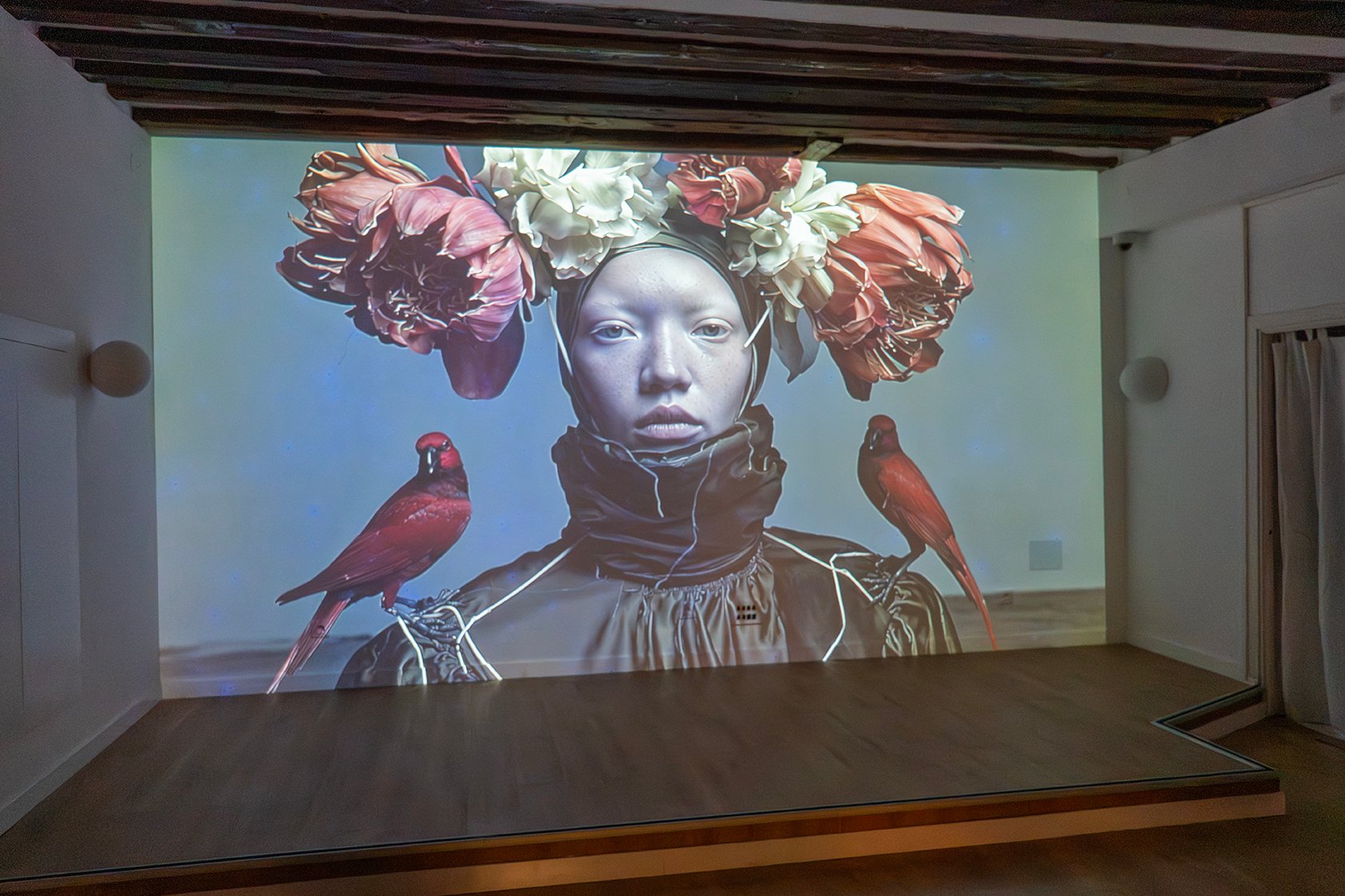 Il nome Cascella porta con sé un certo peso e i più giovani rappresentanti della dinastia hanno scelto l’anonimato del nome d’arte. Il fotografo Matteo Basilé (1974) – al quale l’Istituto di Madrid ha dedicato già una mostra personale nel 2012, Thishumanity – e il fratello, Davide Sebastian (1981), che lavora con le installazioni, sono entrambi figli di Tommaso. La quinta generazione dei Cascella cambia estetica e adotta gli strumenti digitali, ma continua la tradizione familiare – con pixel e algoritmi – per leggere il presente e immaginare il futuro. Rerum Novarum è il titolo delle creature femminili fotografate da Matteo che grazie al fumo delle candele, all’intelligenza artificiale e alla realtà aumentata prendono vita e mutano di forme, acquistando unicità. Davide, invece, predilige l’estetica della performance, documentata nel videoritratto del critico d’arte Gillo Dorfles e nell’installazione Eco del Rinascimento che trasforma una sirena antiaerea in una scultura sonora portatrice di pace.