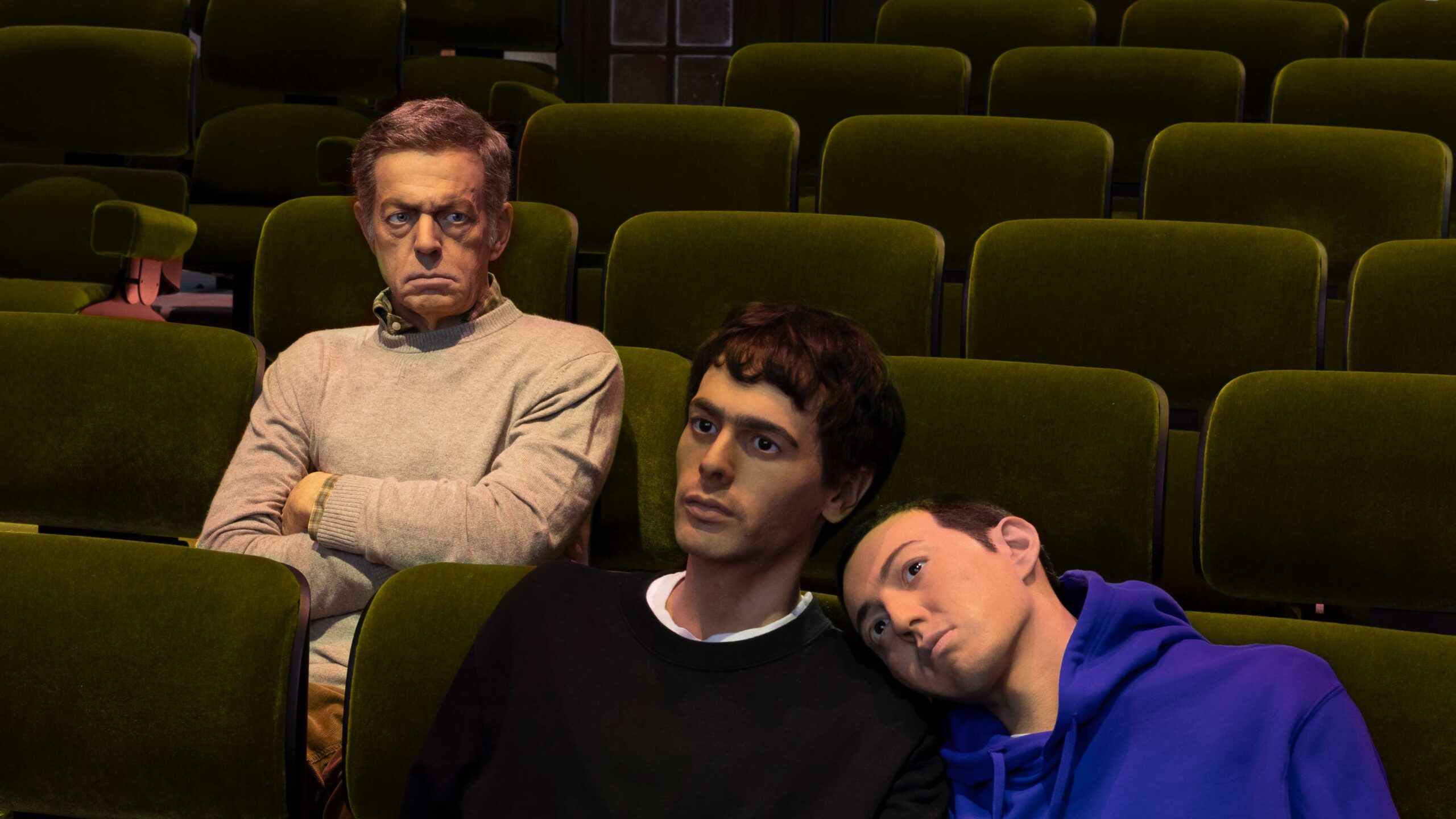 Così, all’interno della grande sala, trasformata in un cinema, un film volutamente sfocato scorre in loop sullo schermo, mentre alcune poltrone vengono occupate da figure iperrealistiche di spettatori colti in diverse posture di attenzione, disattenzione o abbandono. A completare la scena, la scultura The Conversation mostra una donna sola a un tavolo che interagisce via FaceTime con uno dei personaggi del film, cancellando i confini tra realtà e rappresentazione.