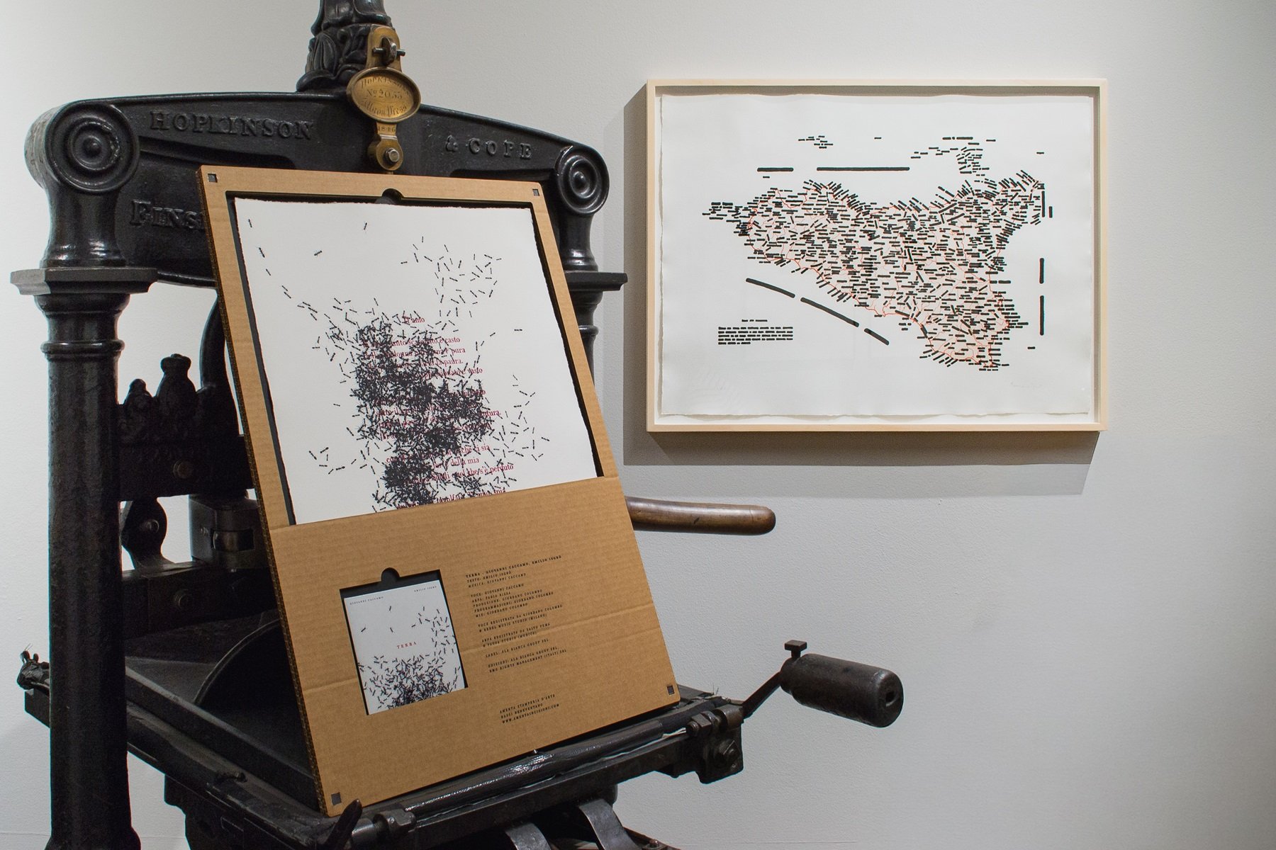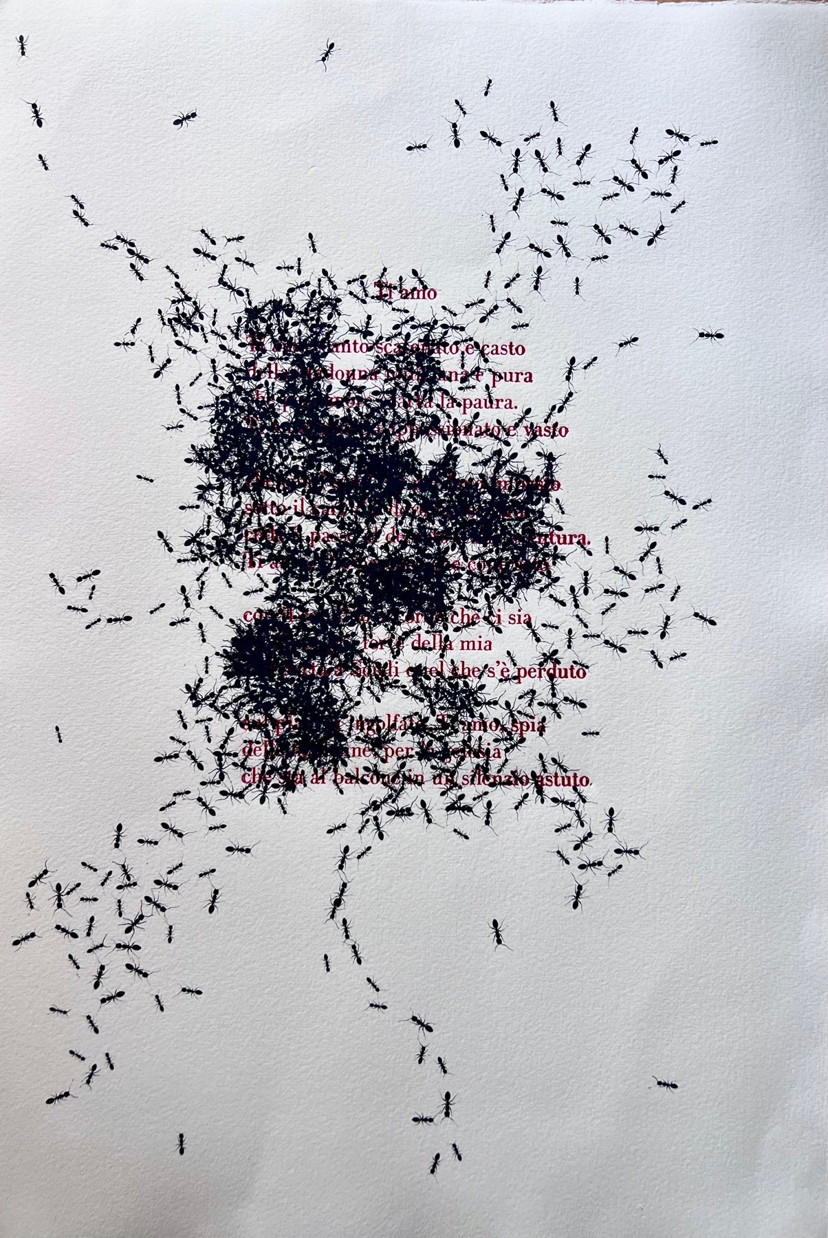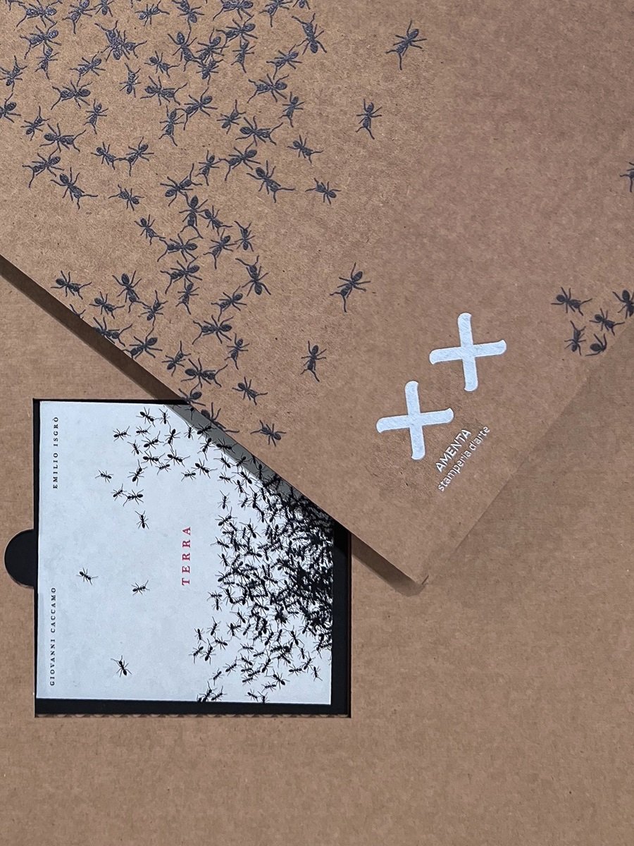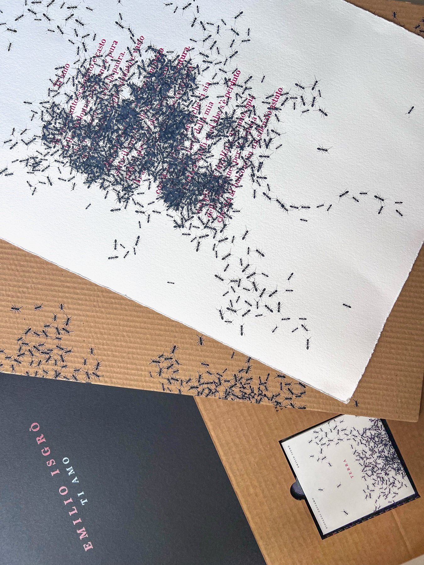 Completano il progetto due grafiche d’artista, ugualmente legate alla mostra al MACC: una cartina geografica della Sicilia, Carta siciliana (2025), riscritta con le classiche cancellature nere – riproduzione dell’arazzo esposto in apertura del percorso espositivo – e la stessa poesia Ti amo (2025), cancellata da uno sciame di formiche. Stampe di grande formato su carta Hahnemuhle, 50 esemplari ciascuna più 6 prove d’artista: acquaforte e acquatinta per la prima; caratteri mobili in piombo, con interventi in serigrafia, per l’altra. A proteggerle delle maxi cartelle in cartone, eleganti ed essenziali, al cui interno trova posto anche il cd con la canzone.