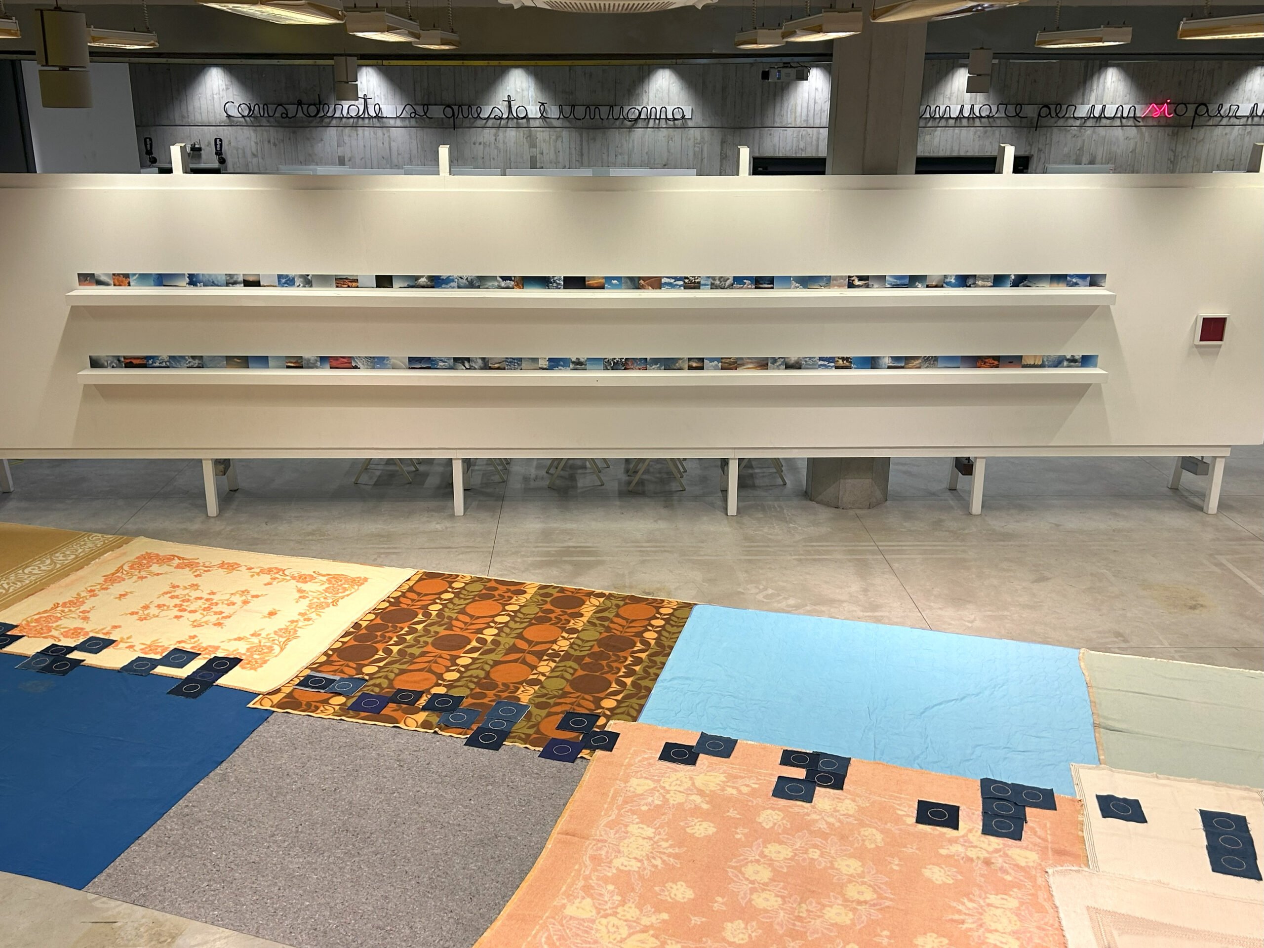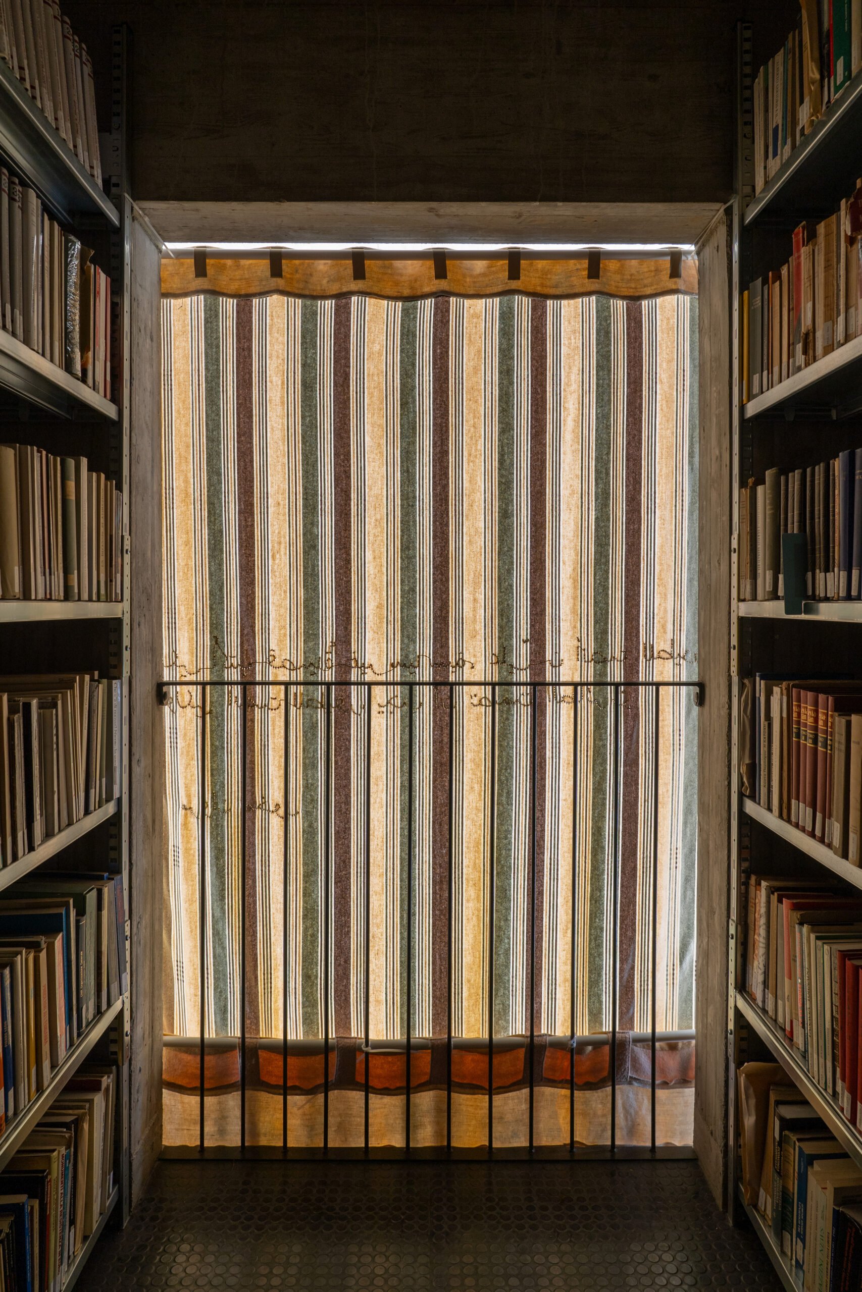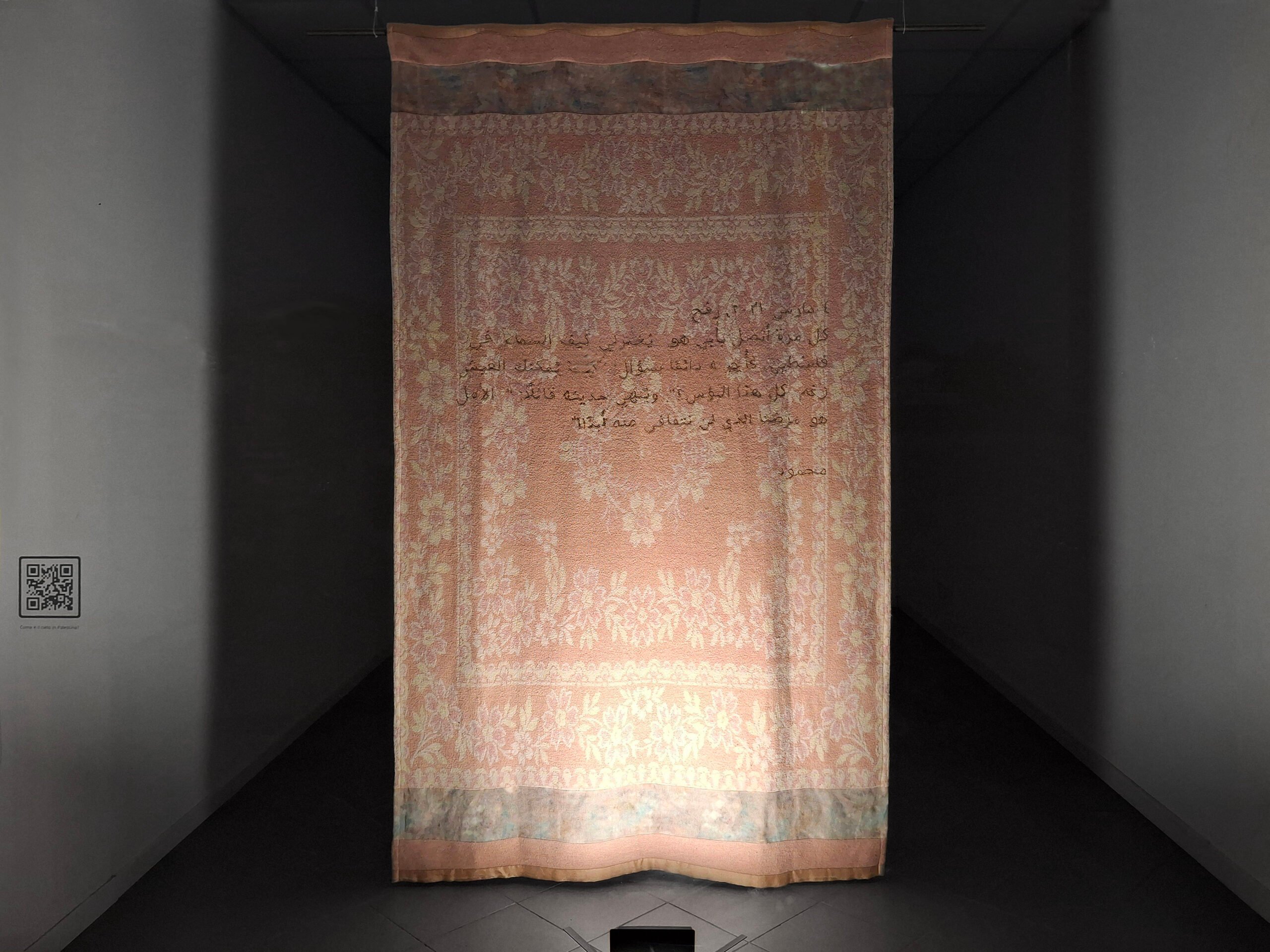 L’allestimento dialoga con l’architettura dell’istituzione e in particolare con gli archivi verticali che custodiscono le testimonianze delle lotte per la libertà e la democrazia. Durante la mostra, questi, restano simbolicamente coperti: un gesto che intende denunciare il rischio di manipolare la memoria storica e, insieme, ricordare la fragilità delle democrazie contemporanee. “Giovanni Gaggia ha scelto di non tacere, di non restare a guardare attraverso una pratica artistica corale. Con uno sguardo poetico e gentile, ha dato anima alle risposte che arrivano da voci palestinesi, trasformando le loro parole in arazzi che brillano come vessilli di speranza, contro il frastuono di bombe e propaganda”, scrive Susanna Ravelli.