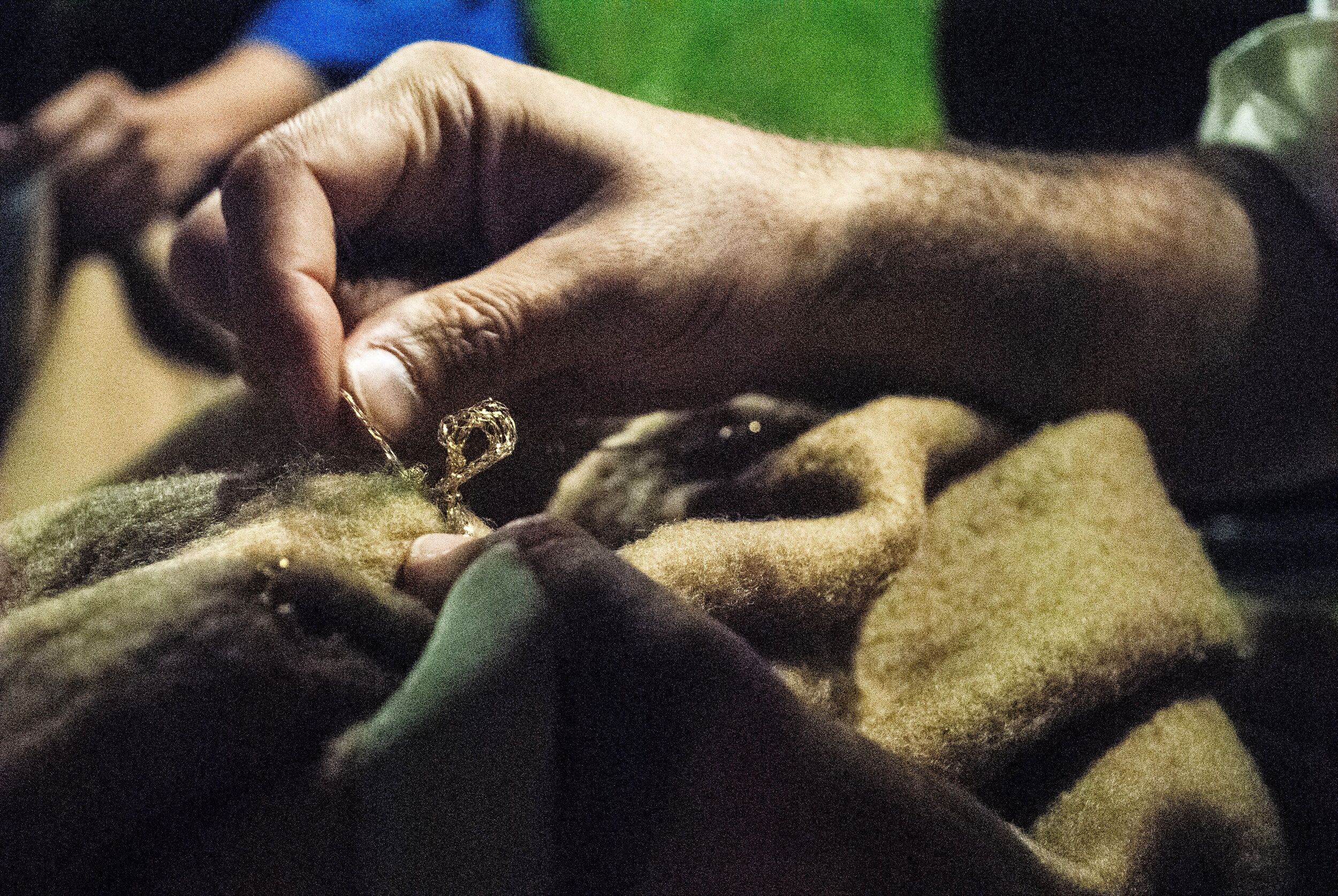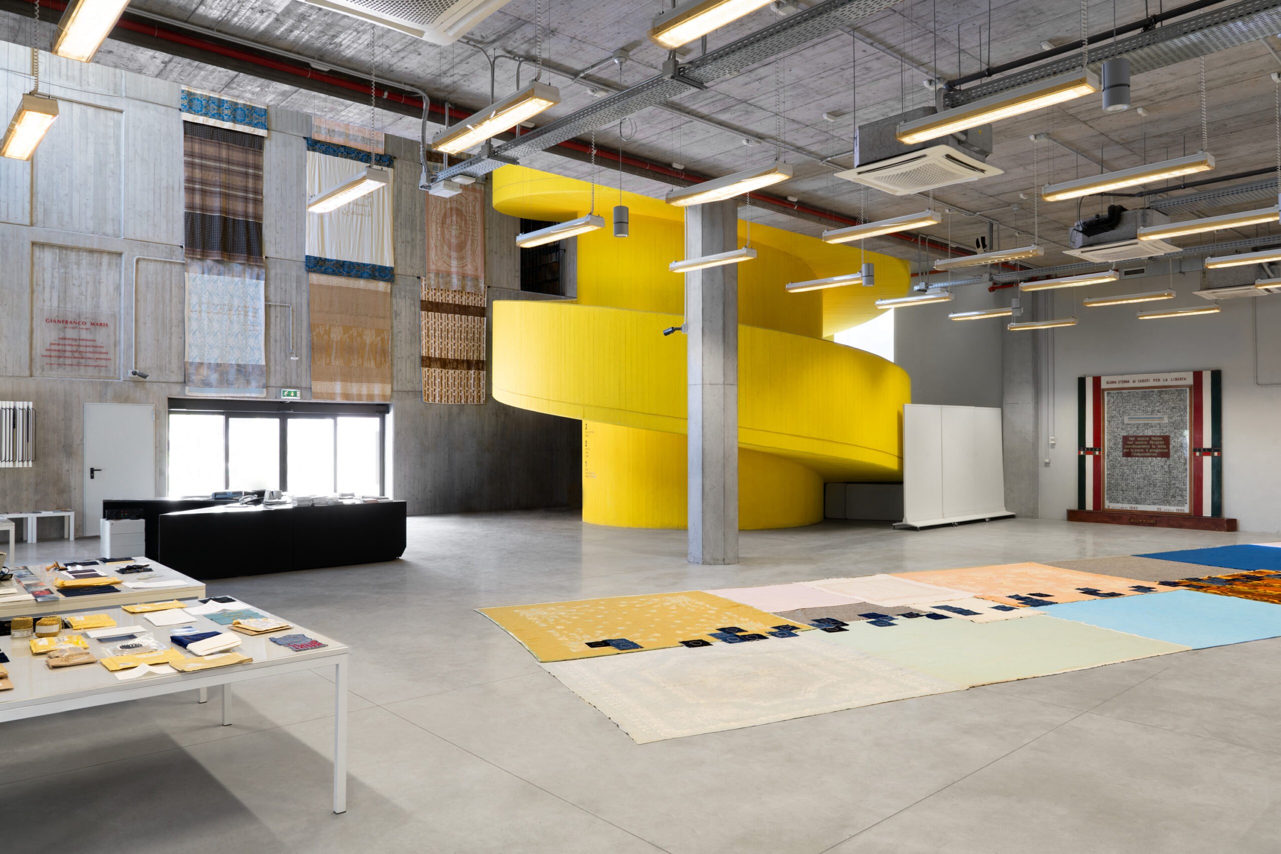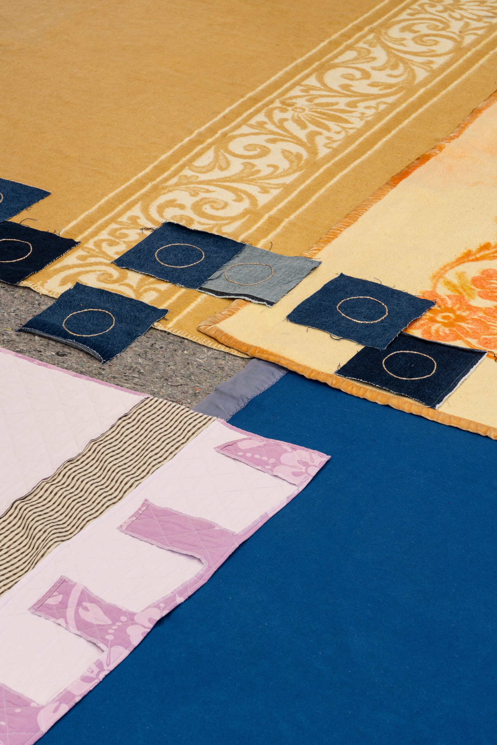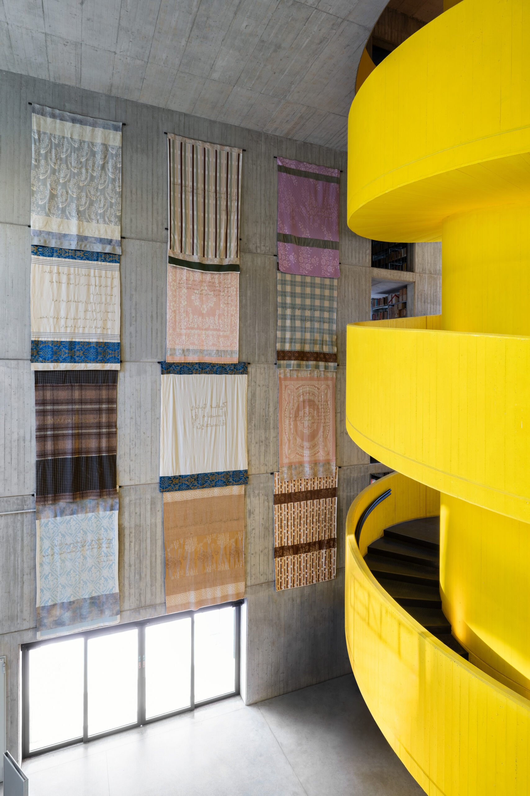 L’allestimento dialoga con l’architettura dell’istituzione e in particolare con gli archivi verticali che custodiscono le testimonianze delle lotte per la libertà e la democrazia. Durante la mostra, questi, restano simbolicamente coperti: un gesto che intende denunciare il rischio di manipolare la memoria storica e, insieme, ricordare la fragilità delle democrazie contemporanee. “Giovanni Gaggia ha scelto di non tacere, di non restare a guardare attraverso una pratica artistica corale. Con uno sguardo poetico e gentile, ha dato anima alle risposte che arrivano da voci palestinesi, trasformando le loro parole in arazzi che brillano come vessilli di speranza, contro il frastuono di bombe e propaganda”, scrive Susanna Ravelli.
