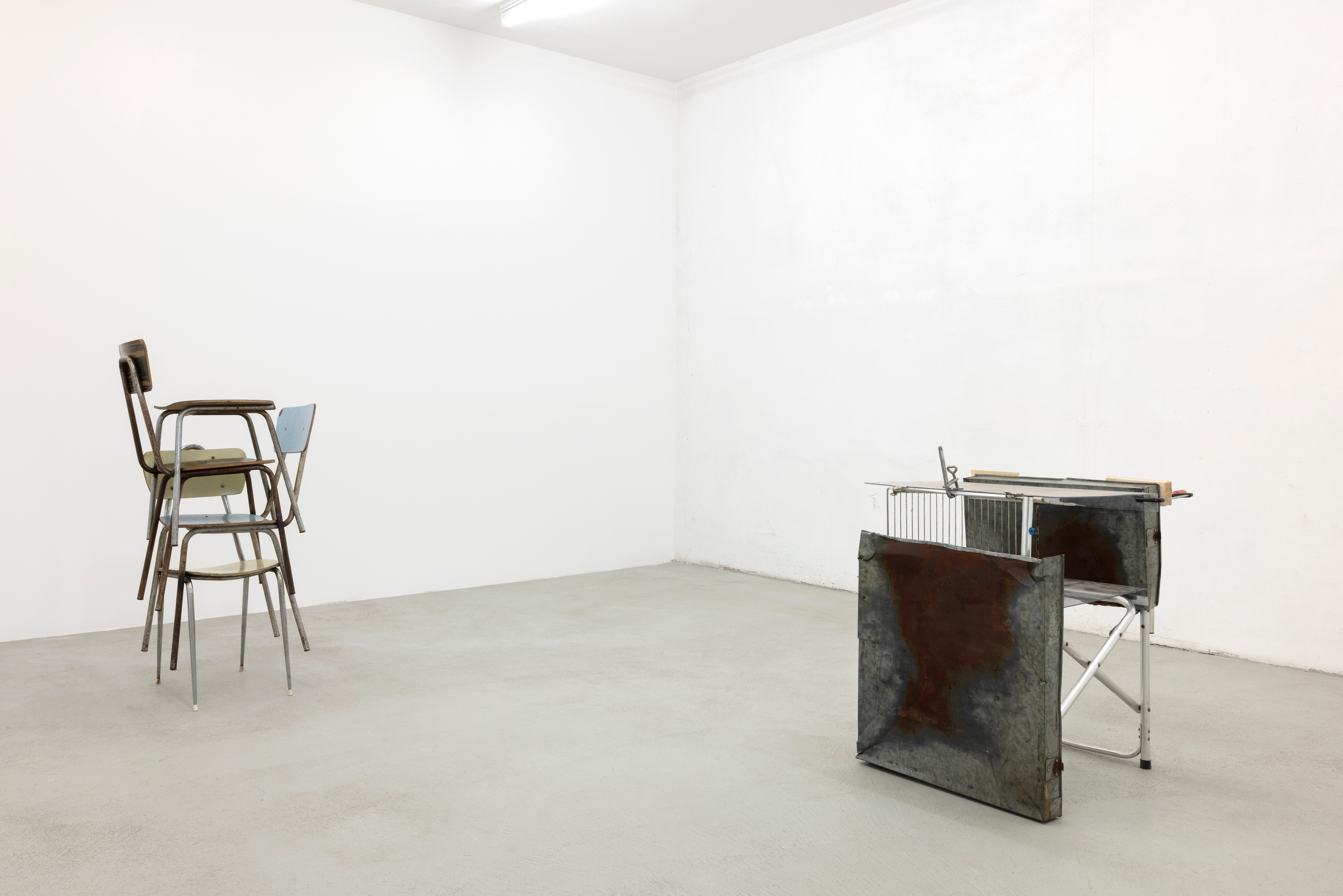 Tutto quello che si vede in mostra è frutto dei ritrovamenti nel garage di famiglia, per strada, sui marciapiedi: oggetti trovati e recuperati, utilizzati per concepire e costruire paesaggi e immaginari che non appartengono al visibile convenzionale. La sua pratica spinge le composizioni verso l’essenza, verso il puro e semplice assemblaggio di pezzi e forme che li conducono a mutare le loro funzioni d’origine. Questi tasselli affrontano una duplice dimensione insita nella poetica di Isabella Costabile: quella più personale e biografica e quella collettiva e condivisa. Quest’ultima permette al pubblico di riconoscere gli oggetti delle composizioni grazie alla propria esperienza individuale antecedente. Le cinque opere disseminate nel percorso mostra, tra cui quattro inedite, sono per la maggior parte di ferro, con parti saldate insieme nei punti di coincidenza proporzionali. Sono elementi propri di un’archeologia della memoria, carichi di ambiguità e potenzialmente soggetti a continue mutazioni. A dare nuova energia a questi pezzi metallici altrimenti inerti è la reinterpretazione: ciò che un tempo era funzionale oggi è strumento per un linguaggio altro. A completare l’operazione sono i titoli, che si affiancano come frammenti poetici e creano un ulteriore strato immaginativo.