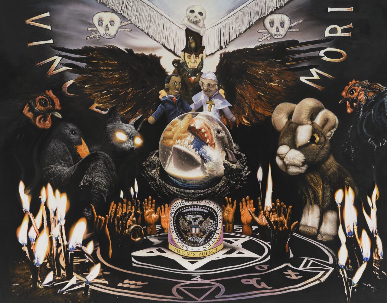 Un arazzo – mappamondo sezionato a parete è una visione dei cinque continenti avvolti nel buio e definiti da un minuzioso ricamo in filo d’oro, fedele alle visioni satellitari notturne. Al centro gli Stati Uniti, dominanti ed intensamente illuminati. La forma dell’arazzo ricorda un insetto, una vespa ragno parassita che inietta le sue larve nel corpo della vittima per farne nutrimento. Animale che in passato ha già “ossessionato” l’artista dando vita alla serie Pepsis. Ferocia sintetizzata anche nella iconica frase di John Lennon e Yoko Ono” WAR IS OVER If you want it” che muta in “If you surrender”, se vi arrendete.