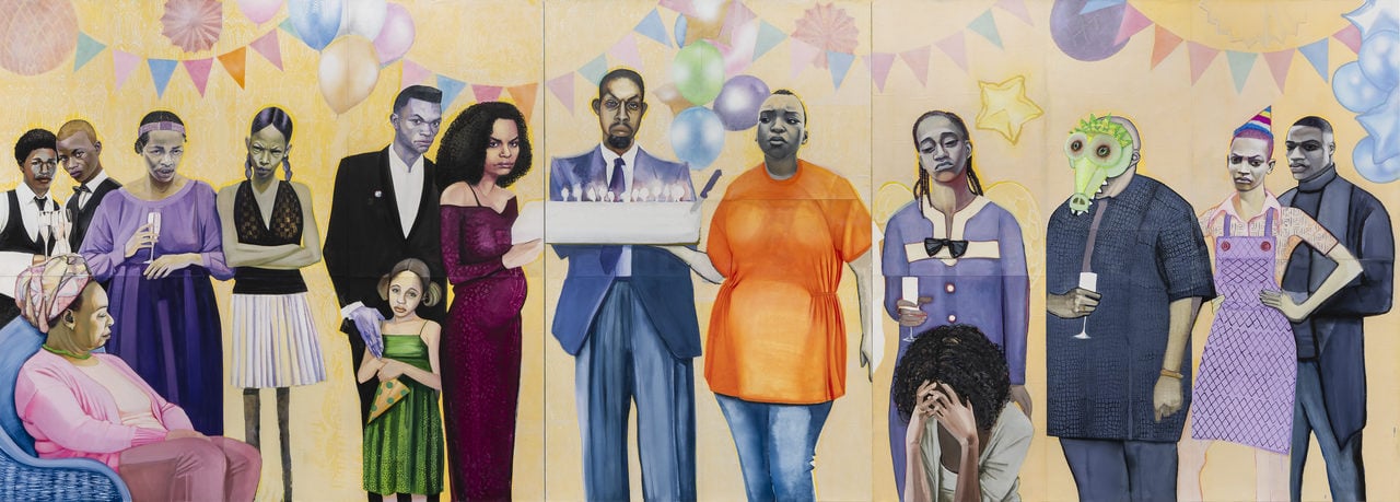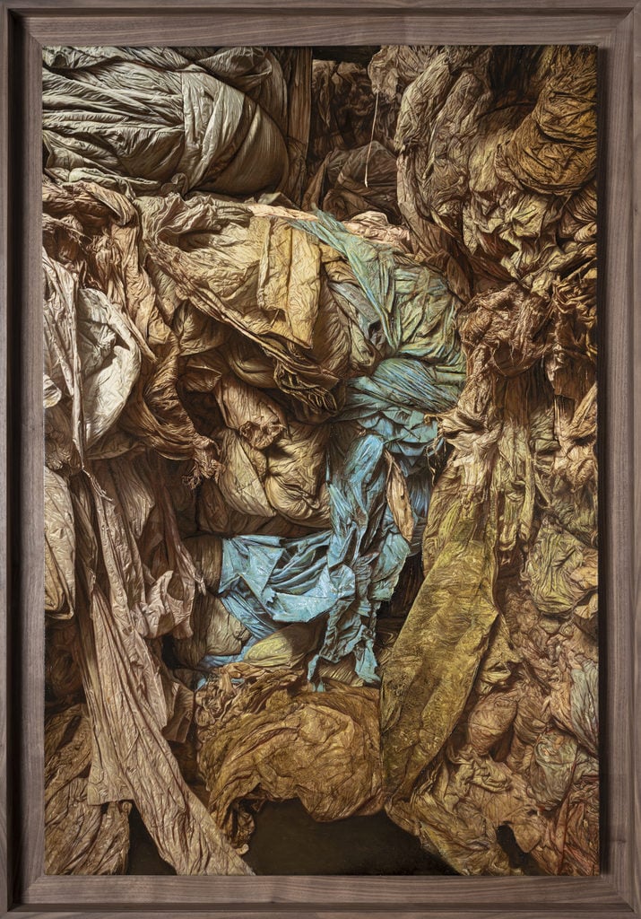 A Polignano un enorme granchio di ceramica campeggia su un maglione di lana, mentre l’installazione Ether en Flocons presenta una serie uccelli creati con complesse procedure di trasformazioni chimiche. “Metamorfosi” è l’altra parola che sempre si associa al lavoro di Roberto Cuoghi. Nella mostra di Polignano è evidente anche in pittura che si fa mimetica con cumuli di immondizie che ci appaiono a prima vista come composizioni astratte. Un orsacchiotto da campagna elettorale di Trump, dilaniato dal cane dell’artista, è un dipinto sospeso tra il tragico e l’ironico. Come i personaggi della popolare serie animata I Griffin, disegnati in un’ipotetica messa in scena dell’Antigone di Sofocle. In un grande acquerello, un frame tratto da un film degli anni Sessanta è trasfigurato: i personaggi bianchi, appartenenti alla middle class americana, diventano afroamericani. Cuoghi definisce questi slittamenti visivi come “stilizzazioni”, rappresentazioni semplificate che rimandano a strutture mentali più profonde.