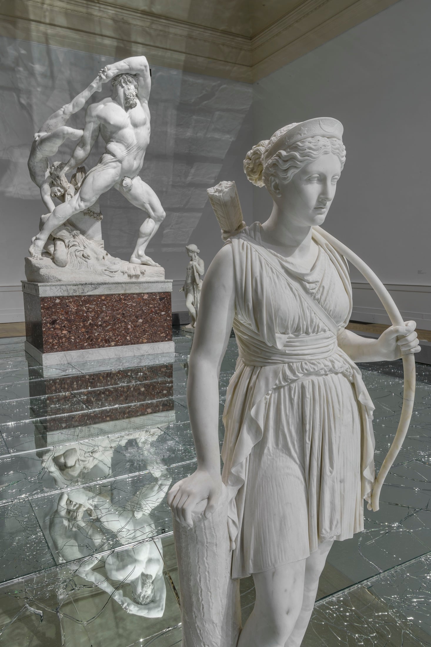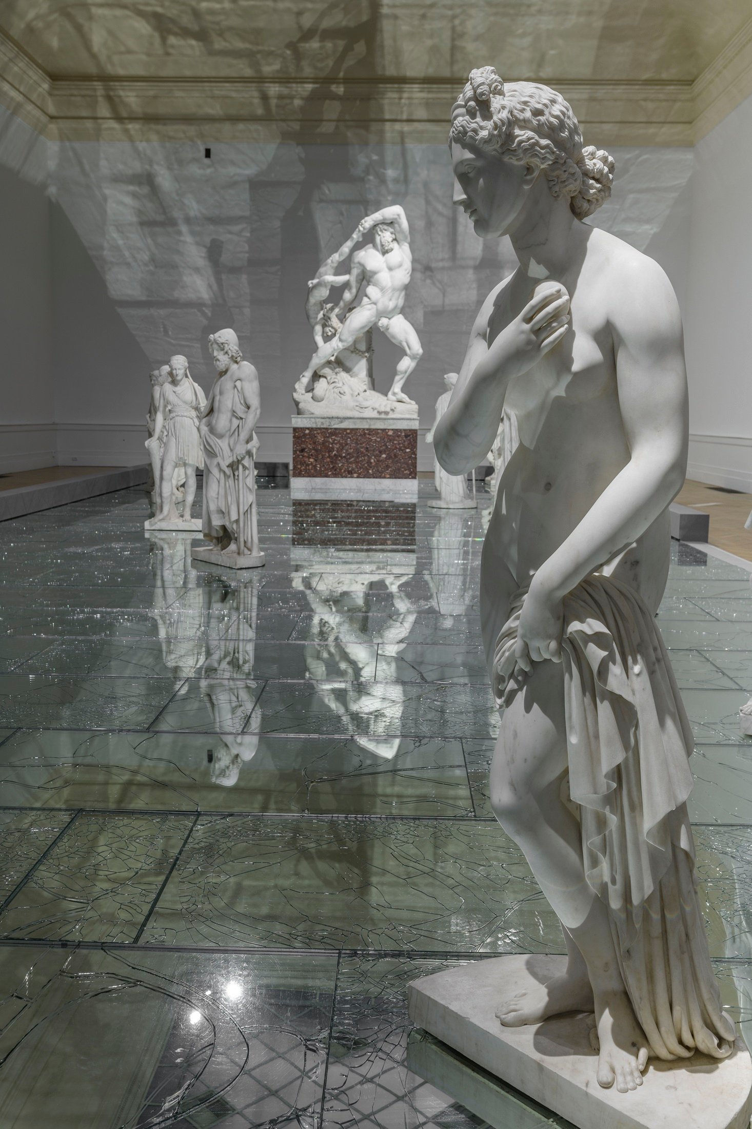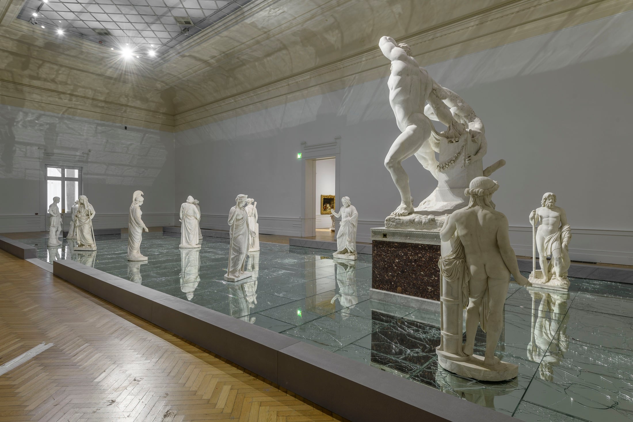 Sul pavimento di specchi – un materiale particolare che si crepa ma non si rompe – lo scontro tra Ercole e Lica è fulcro visivo, generatore di un movimento plastico carico di tensione nervosa, psicologica, narrativa. I due personaggi si ergono sull’alto basamento, immortalati in una posa acrobatica di colluttazione, con la furia di Ercole che afferra Lica per gettarlo il mare. Lo scalpello disegna nel candore del marmo la perfezione dei due corpi avvinghiati e dinamicamente contrapposti, a formare un arco teso sul punto della rottura, là dove il gesto muscolare raggiunge l’acme e si consuma. Pirri posiziona sullo specchio 12 sculture in marmo provenienti dalle collezioni, un pantheon di divinità classiche scolpite da artisti operanti a Roma, coevi di Canova e riconducibili al suo entourage: tra questi anche il danese Bertel Thorvaldsen. Tutte opere commissionate dal Principe Alessandro Torlonia.