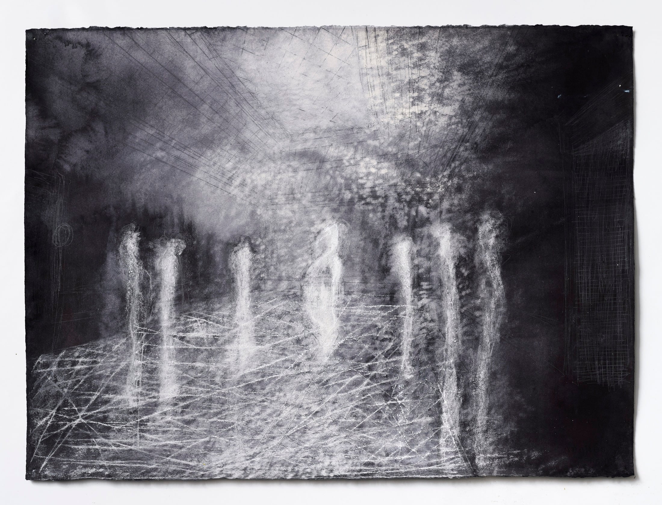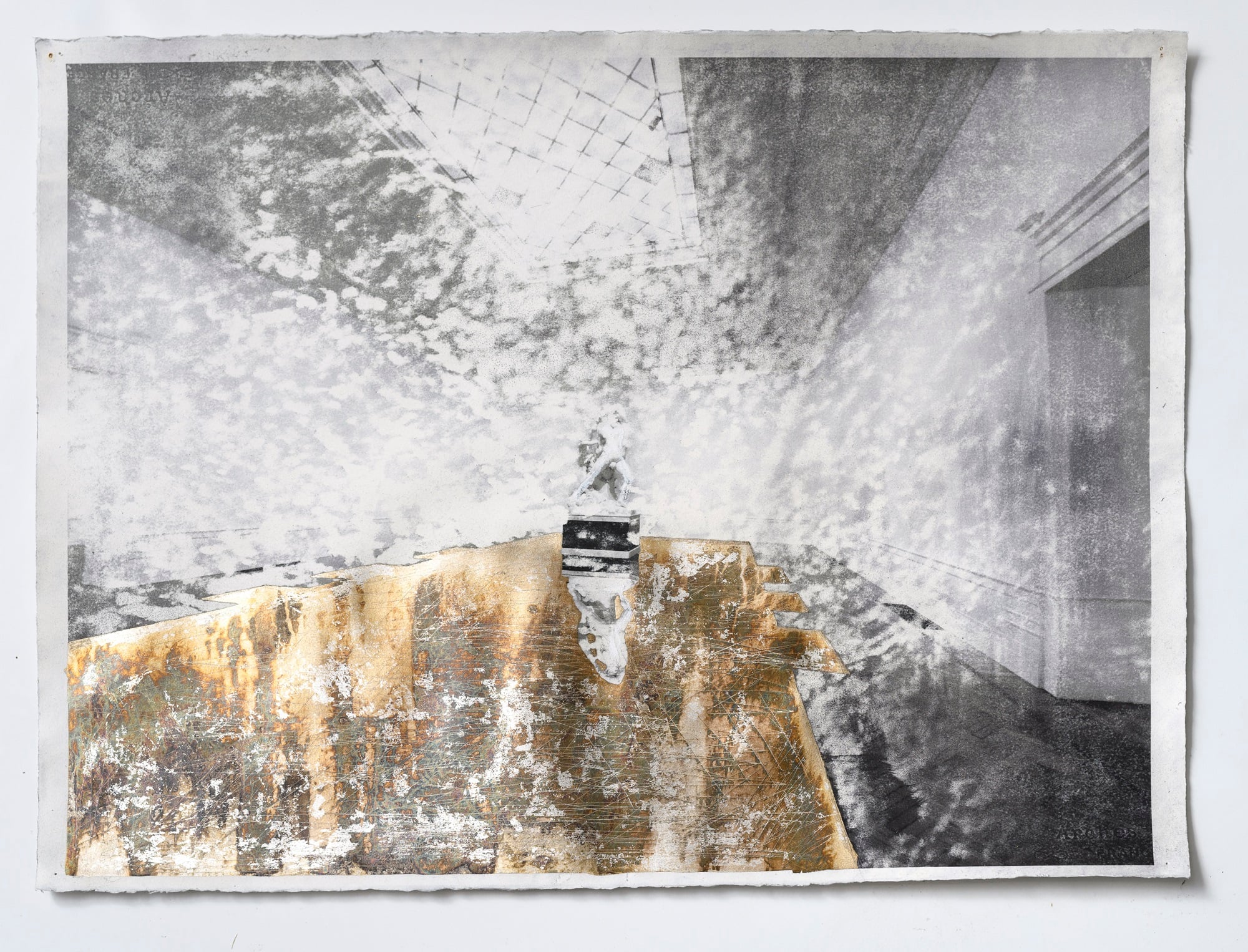 Sofferto era stato lo smontaggio della grande installazione progettata da Pirri nel 2011 per l’atrio del Museo: una spettacolare ouverture, un’opera ambientale che accoglieva i visitatori prima dell’immersione tra le sale espositive. Gli specchi infranti e calpestabili, cuore del suo storico ciclo Passi, diventavano abisso immaginifico per una costellazione di statue femminili ottocentesche, selezionate dai depositi, liberate dai loro plinti e poste in dialogo con una maschera funebre di Canova: un coro di spettatrici mute e un’istantanea tridimensionale, doppio marmoreo del volto cristallizzato nel tempo. Il nucleo di opere antiche occupava così il suolo riflettente, continuamente calpestato, inciso e riscritto dai passi delle persone, esattamente come si attraversa e si frantuma il passato, nell’esercizio libero della critica e della conoscenza.