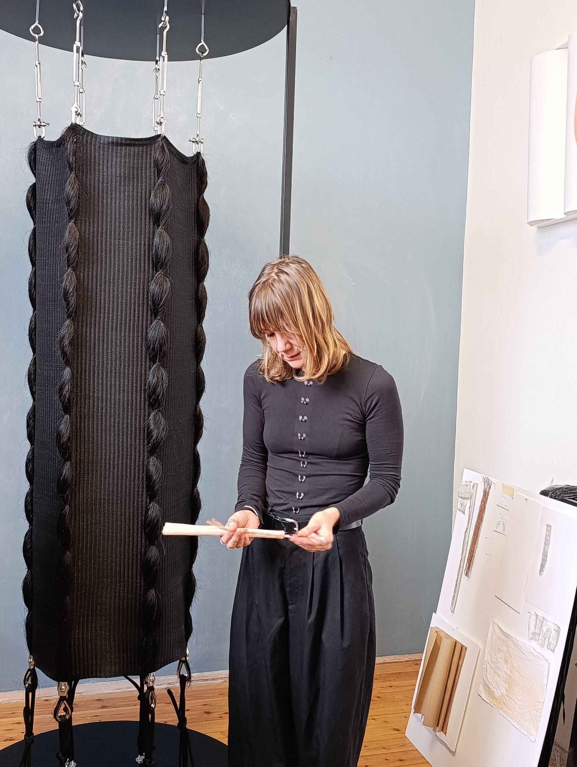 Spostandoci verso la stazione ovest di Vienna, negli atelier di Westbahnstraße – parte del programma municipale Förderateliers che sostiene gli artisti con studi luminosi all’ultimo piano di un palazzo liberty – la svedese Elisabeth Kihlström lavora tra tessuti metallici, musica e scultura. “Il tessile non è un tema, ma uno strumento per pensare”, spiega davanti alle sue tele intrecciate con fili d’argento ossidato. L’artista, che unisce ricerca scientifica e materia preziosa, lavora oggi a un film sulla Pinna nobilis, la grande conchiglia del Mediterraneo da cui si ricava la seta marina, “un materiale che ha attraversato i secoli e ora sta scomparendo per sempre”, racconta. La sua opera lega mito, storia e crisi ecologica in un racconto che parte da Aristotele e arriva all’emergenza climatica.