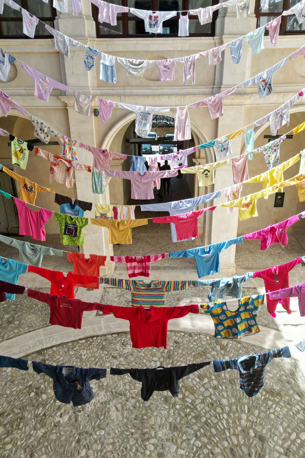 Il percorso nel dettaglio prevede opere composte da fibre, tessuti e abiti presenti ovunque, a cominciare dallo spazio della corte dove l’installazione Towards Tomorrow dell’artista finlandese Kaarina Kaikkonen, si fa quasi biglietto da visita dell’intera esposizione. L’opera, composta da abiti di bambino donati dalla comunità aquilana e allestita con l’aiuto di alcuni volontari, è una vera propria metafora di come passato e presente possono dialogare nel dare origine qualcosa di nuovo, attraverso il senso di innocenza e fanciullezza dei più piccoli.
