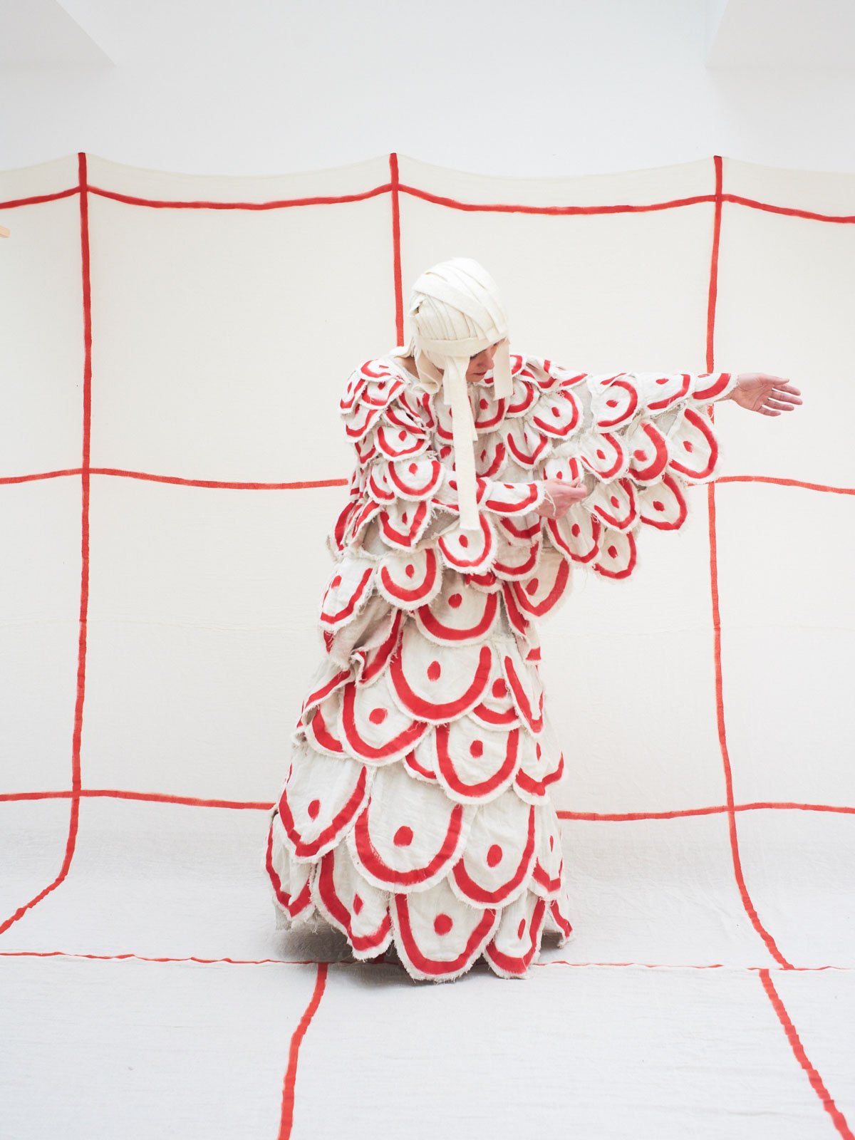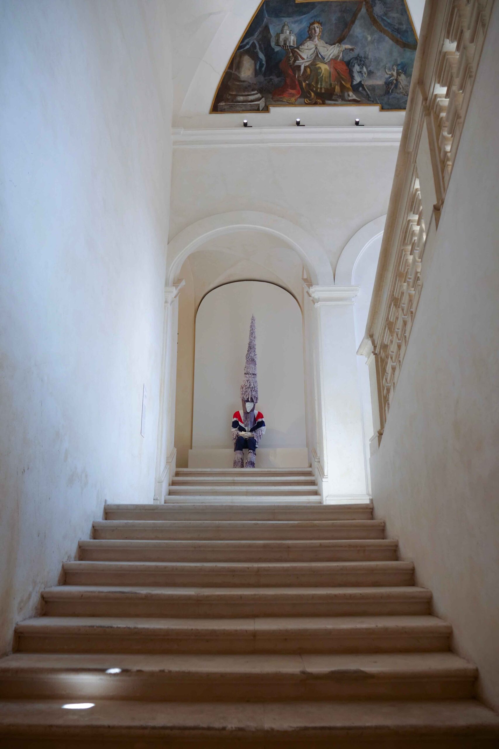 Da questa opera condivisa, si direbbe d’arte pubblica, si passa agli interni dove s’incontra prima il lavoro di Jacopo Belloni con il misterioso personaggio Girigogolo, poi le opere di Isabella Ducrot, di Kimsooja e di Yto Barrada dove materia e parole, ancora e sempre passato, memoria e poi presente, nomadismo, condizione errante, rappresentano un insieme di concetti, solo in apparenza distinti ma ben uniti nella relazione fra le opere di questi artisti. Ancora, incontriamo gli interventi di Olga de Amaral, figura chiava dell’avanguardia fiber art internazionale, di Paola Pivi, maestra nel senso di stupore e meraviglia, di Dana Awartani, intensa sul tema delle ferite, in questo caso quelle delle architetture fotografate post sisma 2009, del collettivo Gelatin con costumi in mostra ironici, quasi interattivi. E poi infine le opere di Abdoulaye Konaté, Sanford Biggers, Hassan Musa, Yinka Shonibare, Sheila Hicks, Claudia Losi, Alex Cecchetti, Adelaide Cioni, Marion Baruch, Rosemarie Trockel, Franz West e Rosemarie Trockel.