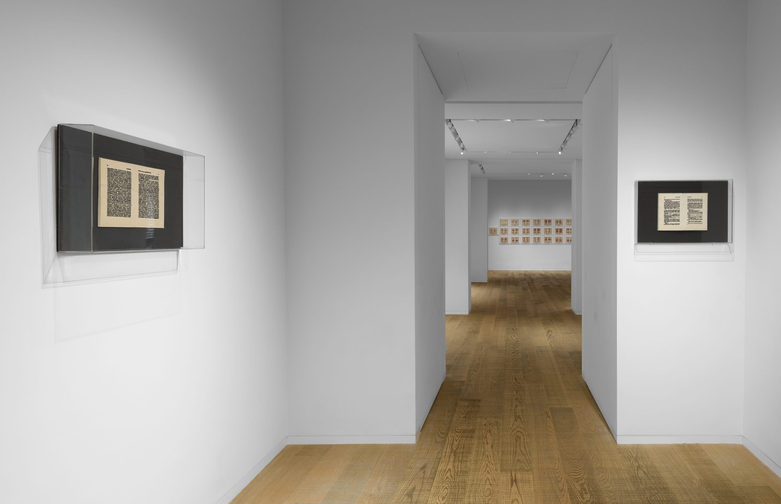 La mostra di Isgrò, che si posizione sul crinale tra arte e poesia, è allestita in senso cronologico e comincia con alcune cancellature degli Anni Settanta – Sopra un fiore (1971), E venne poi (1971), Vitale (1972) e Filippo (1972) – per poi allargarsi con un gruppo di lavori realizzati negli Anni Duemila, dedicati ad alcuni grandi classici della letteratura, dall’Odissea di Omero ad alcune tragedie di Shakespeare, come Macbeth, Otello e Romeo e Giulietta. Quest’ultima è protagonista dell’opera più scenografica, Romeo e Giulietta (2022) composta da 38 elementi dove si alternano sulle pagine del dramma cancellazioni rosse e nere, quasi a comporre una sinfonia “in negativo”, in dialogo ideale con Othello (2019), che riunisce 36 elementi. “Un affresco dove la storia non è più illustrata ma è narrata alla vista attraverso le parole”, sottolinea acutamente Bazzini. L’unica opera dove le cancellature sono disposte in maniera da comporre un’immagine è Odysseus (2018), che presenta al centro la sagoma di un veliero, a ricordare i viaggi di Ulisse. Una soluzione suggestiva ma un filo troppo decorativa, più distante dal cuore di una ricerca che ha trovato nel rigore minimalista di Isgrò la sua espressione più alta.
