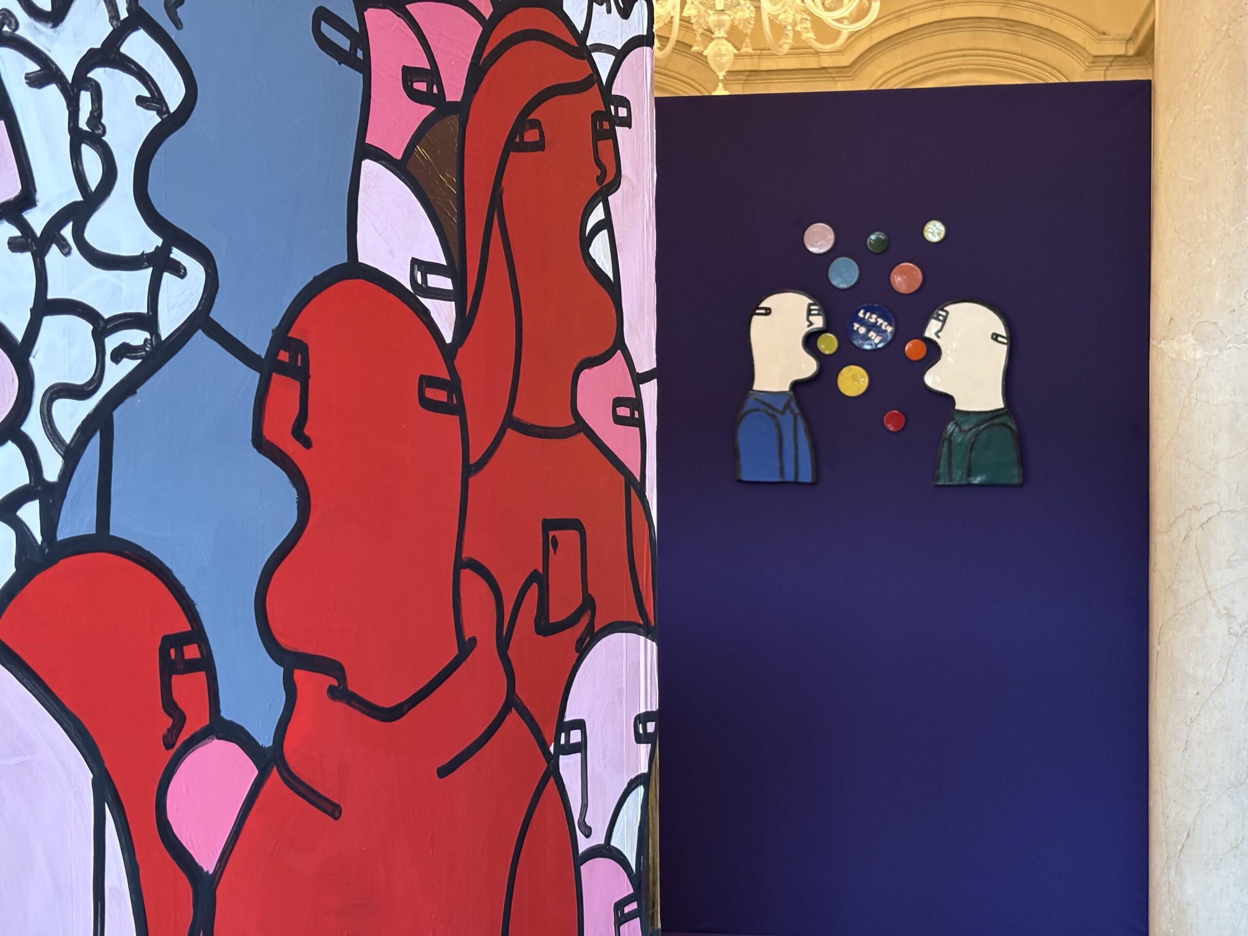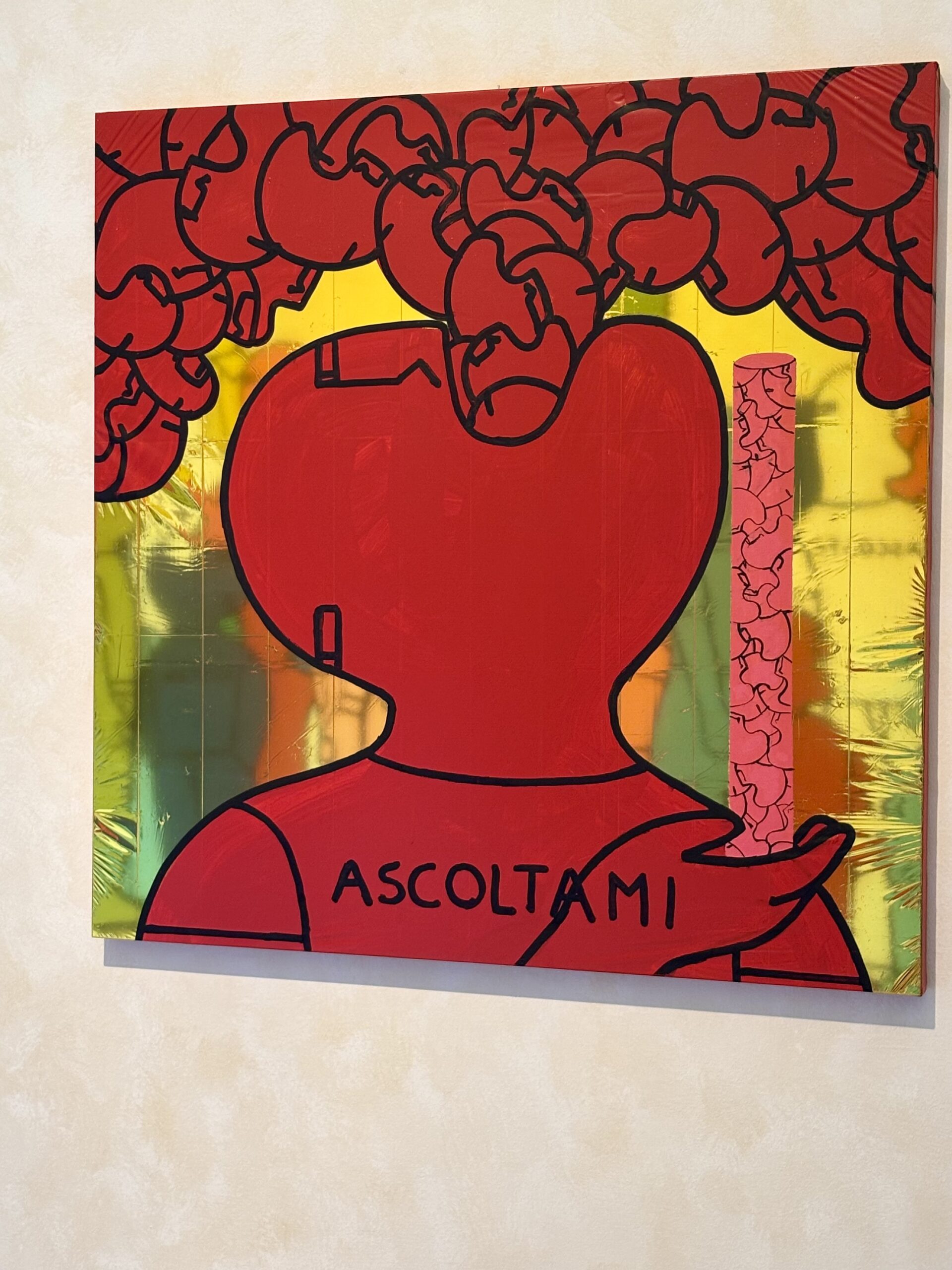 Le opere lungo il percorso, realizzate in diversi medium – coperte isotermiche, ceramica, legno, neon – creano un ambiente immersivo che diventa famigliare ai visitatori non solo per il ricorrere degli iconici personaggi che le popolano; ma anche per un secondo denominatore comune, altra cifra stilistica dell’artista: la presenza del linguaggio verbale, ovvero della parola scritta, che in italiano o in inglese, rafforza e amplifica il significato delle opere.