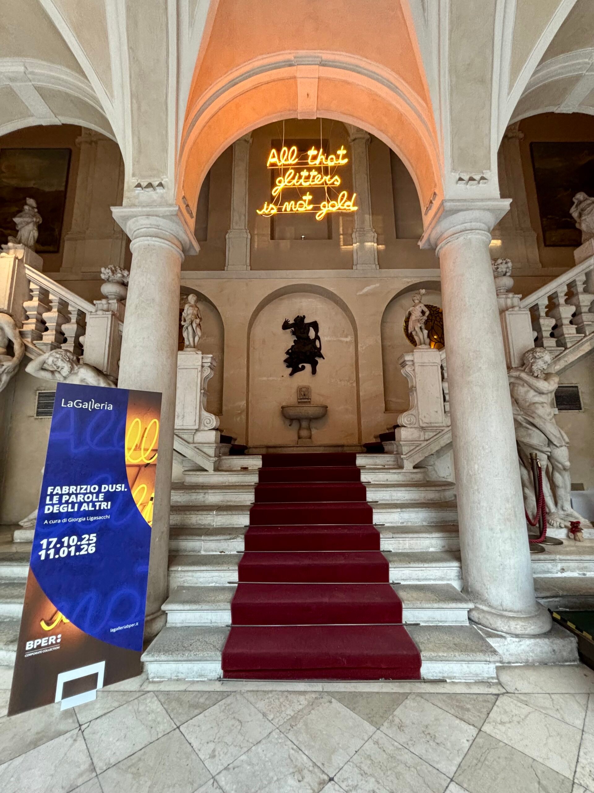 Dal mito della Torre di Babele all’Annunciazione, il dialogo come opportunità di crescita è protagonista della mostra “Fabrizio Dusi. Le parole degli altri”, personale dell’artista di Sondrio nella Galleria BPER di Palazzo Martinengo di Villagana