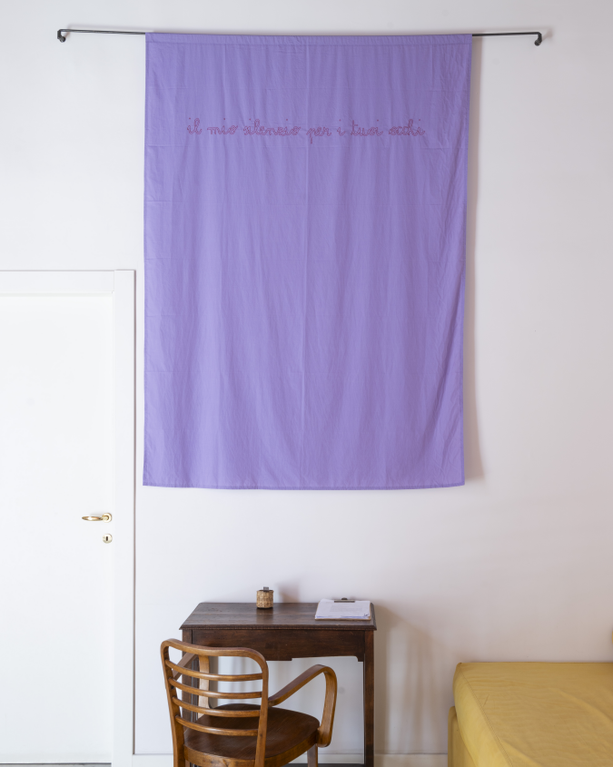 Un senso possibile alla riflessione espositiva sul confine, non a caso a fine percorso, pare offerto proprio dall’elegante levità di Teresa Gargiulo, a cura della Galleria Tiziana Di Caro: mio/tuo/collettivo, suono/sguardo/tatto, nascosto/esposto/condiviso si fondono nella frase “il mio silenzio per i tuoi occhi”, ricamata su un telo a muro lasciato in libera sospensione, viola come il chakra dello spirito, quasi oggetto da meditazione.