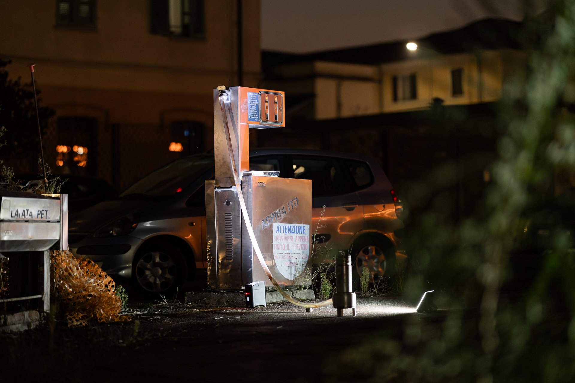 Le opere sono state installate direttamente sui macchinari arrugginiti dell’autolavaggio, che diventano parte integrante del lavoro.