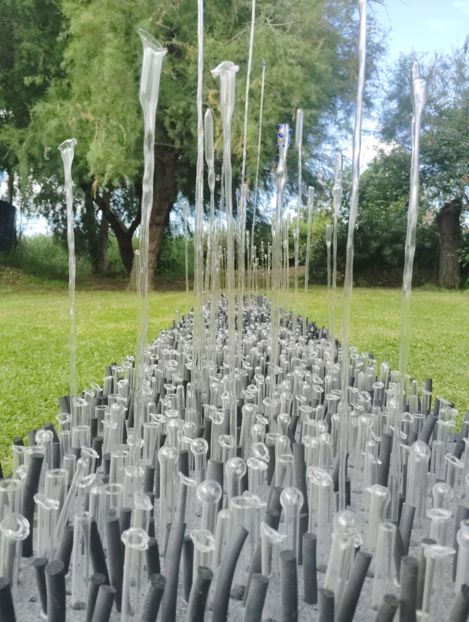 Parte dell’iconografia dell’artista, questi piccoli eden sono stati concepiti negli anni in luoghi diversi, con dimensioni e soluzioni di allestimento sempre nuove. Se ad esempio nel 2010, a Seravezza, in provincia di Lucca, Sciortino ne installava uno fra i massi e i flutti di un corso d’acqua fluviale, nel punto di convergenza tra i torrenti Serra e Vezza, là dove si origina il fiume Versilia, nel 2023, all’esterno del Museo Oddi Ricci di Piacenza, piantava tra l’erba incolta del terreno gli stessi elementi trasparenti, fitti e dritti come steli, qui e là sormontati da boccioli vitrei colorati, modellati dalla fiamma. Due esperienze costruite sulla dialettica e la prossimità tra naturale e artificiale.
