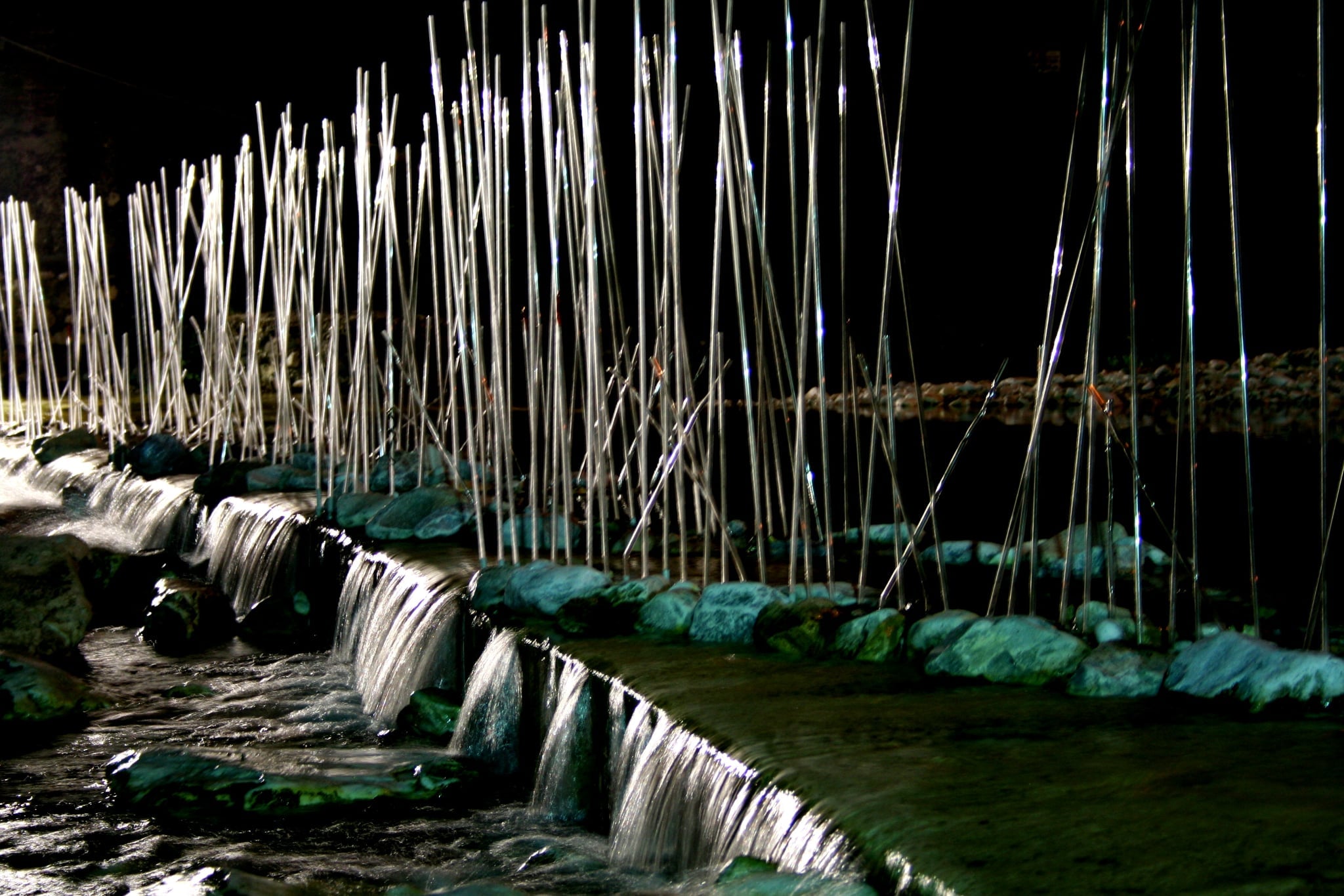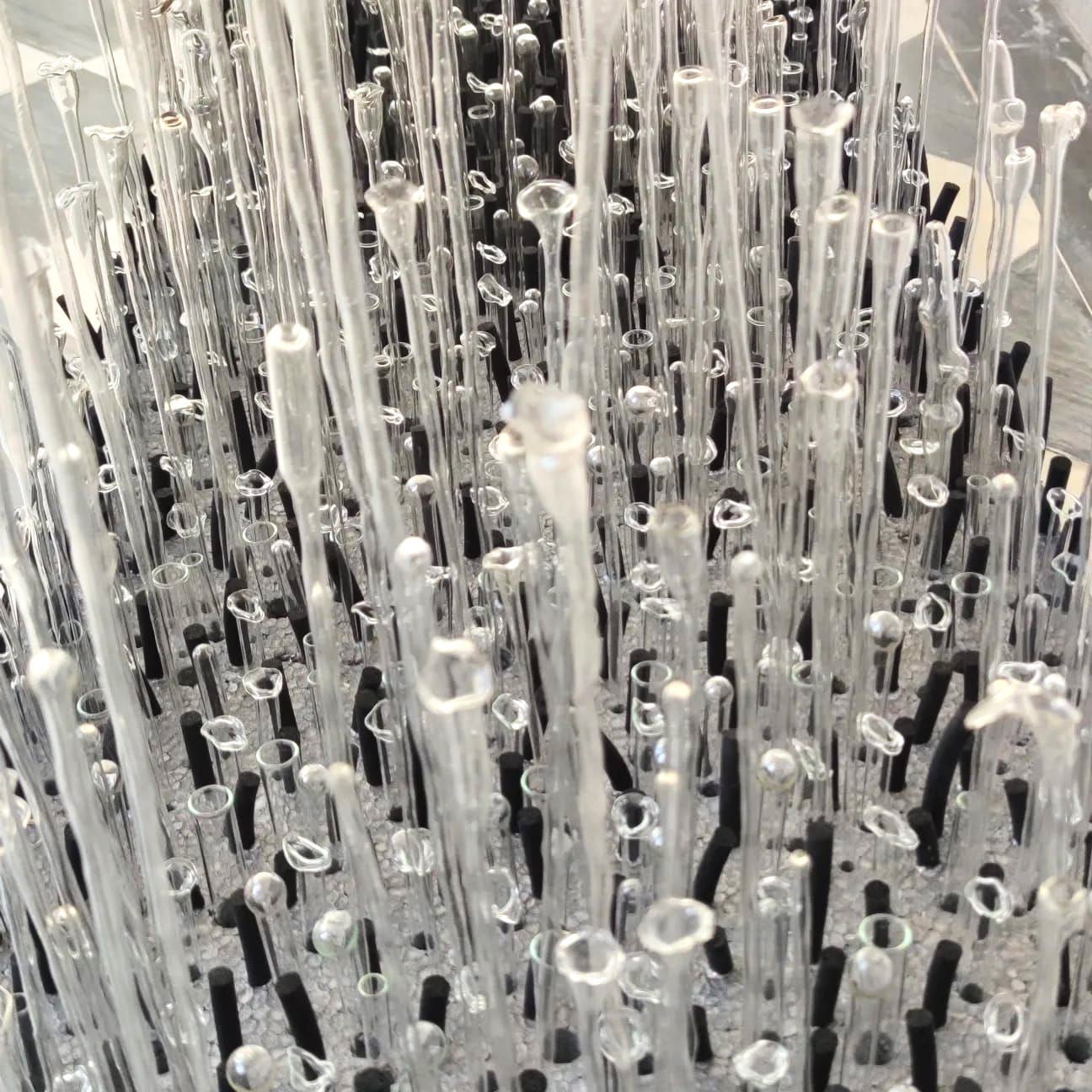 Sciortino vi costruisce un giardino di vetro soffiato, lasciando sbocciare una selva di steli trasparenti direttamente dal suolo: sono 2.500 stalagmiti, scintillanti e irregolari, piantate su altrettanti fori praticati nel cemento e raccolte in un cerchio perfetto, a simulare un’aiuola di ghiaccio. È l’azione clinica e dolce della fiamma a consentire la formatura del vetro, con un’operazione di millimetrica precisione che tiene l’oggetto su un punto generativo di equilibrio, a un istante dalla rottura. Preziosità dell’effimero e imperfezione armonica dell’esistenza. L’effetto è onirico, con questa pioggia capovolta, questa arborescenza ordinata e circolare, sagomata nel buio da un’unica luce puntata. Dal fascio radente e basso viene il suggestivo doppio: proiettati sulle pareti attorno, i fragili fusti disegnano un altro giardino magico, trama d’ombra che mette in movimento lo spazio delicatamente.