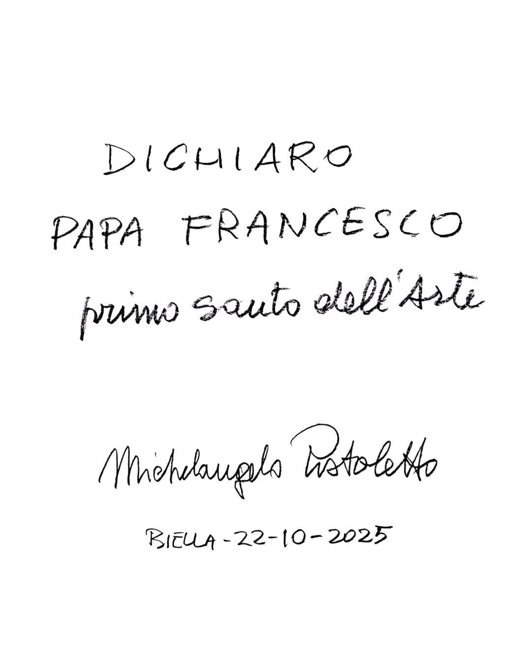 Il gesto compiuto da Michelangelo Pistoletto il 17 dicembre 2025 – la proclamazione di Papa Francesco come primo santo dell’arte – non si lascia leggere come una semplice trovata mediatica. Al contrario, si presenta come un atto artistico nel senso più forte: un gesto che istituisce senso, produce realtà simbolica, e ci costringe a riconsiderare il rapporto tra arte, immaginazione e sacro nel presente. Dall’immagine della croce sulla tomba a Santa Maria Maggiore alla forma video-specchiante dell’opera dell’artista: un atto che non canonizza, ma sposta di campo, riattivando un’aura dentro la tecnica e aprendo uno spazio di senso condiviso.