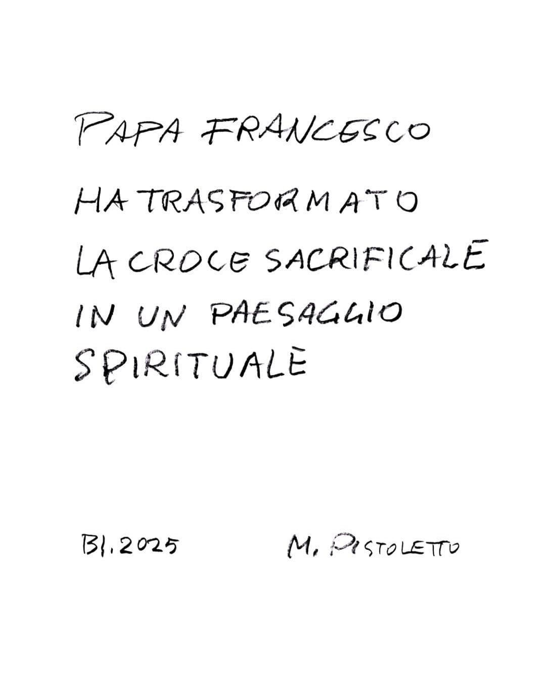 L’origine dell’opera non è teorica. È visiva. Pistoletto mi raccontò di essere rimasto colpito dalle immagini televisive della tomba di Papa Francesco a Santa Maria Maggiore: una lastra sobria, una croce. In un primo istante quella forma poteva rimandare alla crocifissione, alla sofferenza; poi, guardandola meglio, sembrò aprirsi come un orizzonte, non più un segno verticale del sacrificio ma uno spazio abitabile. È da questa “imposizione dell’immagine” che il gesto ha preso avvio, fino alla decisione maturata nel cuore della notte: “Francesco ha voluto morire da artista. Ha fatto della propria vita un’opera”.